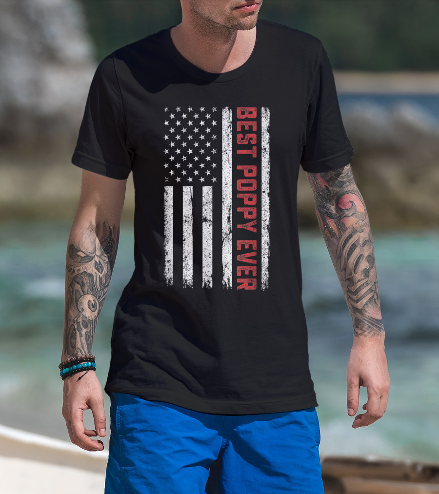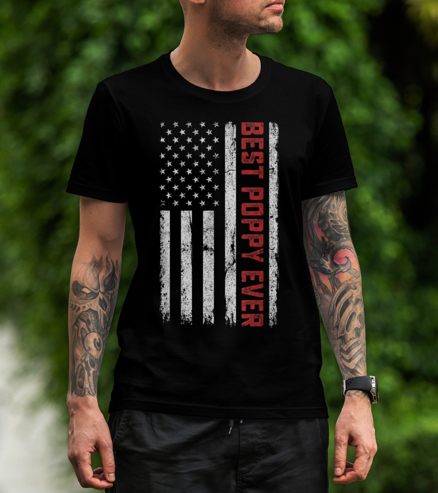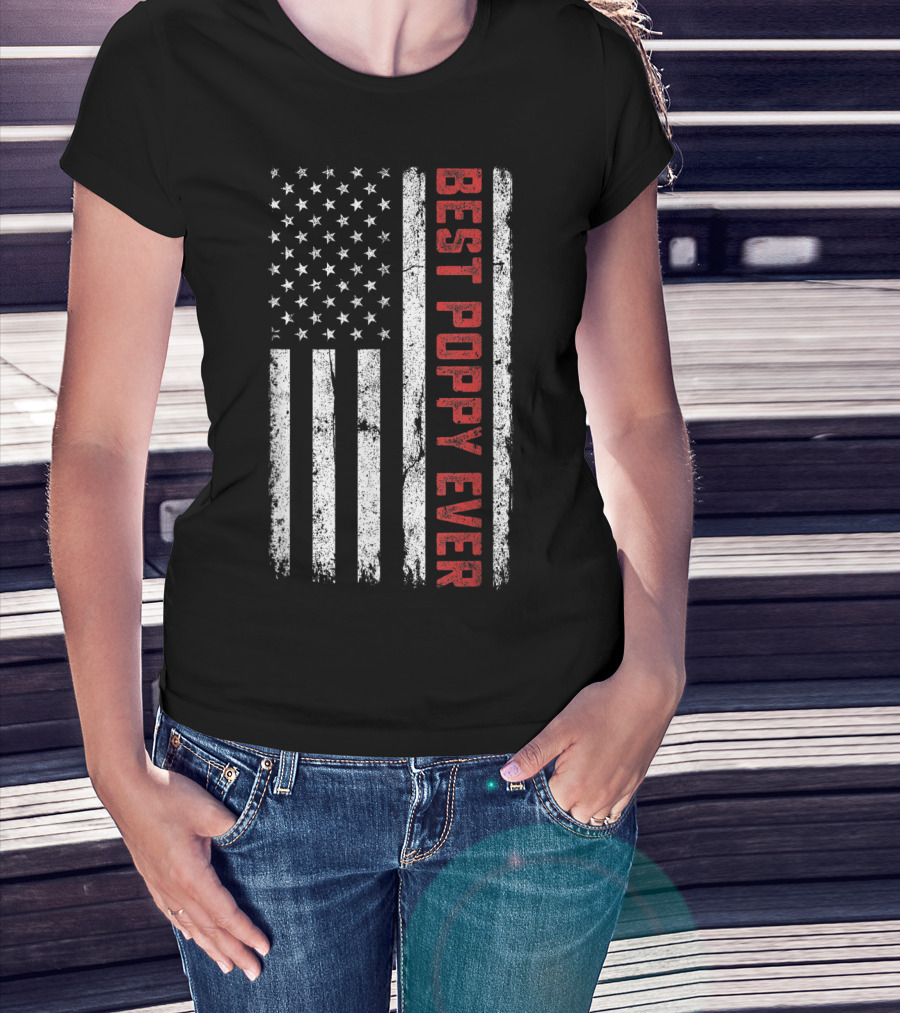 The Best Poppy Ever American Flag USA T-shirt is designed for everyday wear and a consistent fit. Fabric is pre-shrunk ring-spun cotton with durable stitching. See the size chart below for exact measurements.