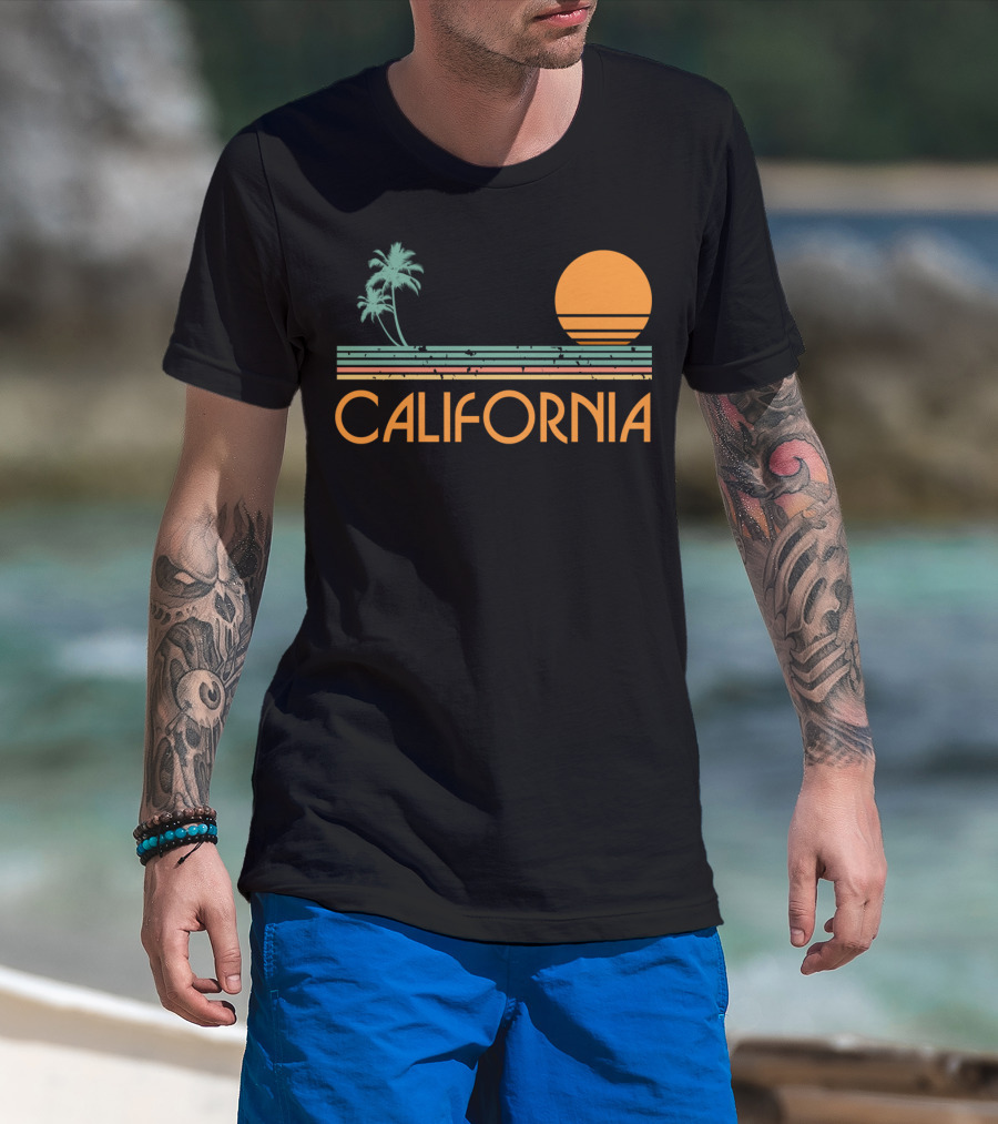 The California Retro Sunset Palm Beach Vintage T-shirt is designed for everyday wear and a consistent fit. Fabric is pre-shrunk ring-spun cotton with durable stitching. See the size chart below for exact measurements.
