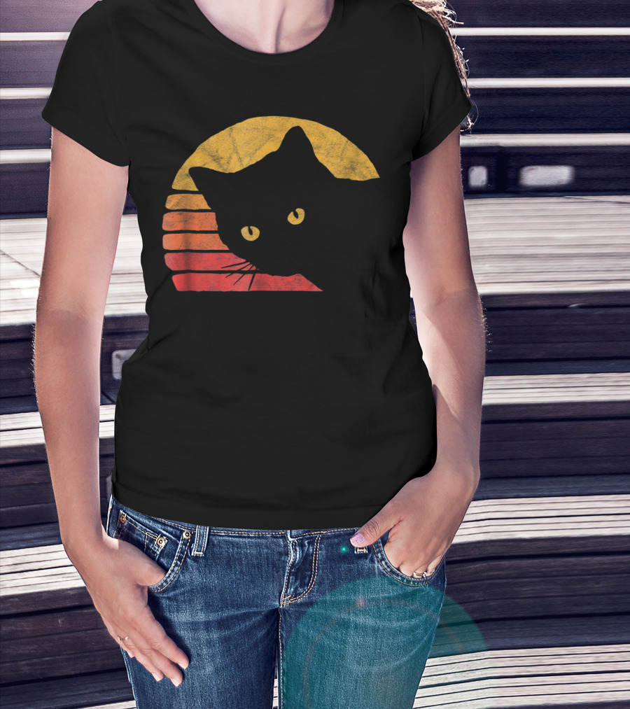 The Vintage Eighties Style Cat Distressed Silhouette Retro Sunset T-shirt is designed for everyday wear and a consistent fit. Fabric is pre-shrunk ring-spun cotton with durable stitching. See the size chart below for exact measurements.