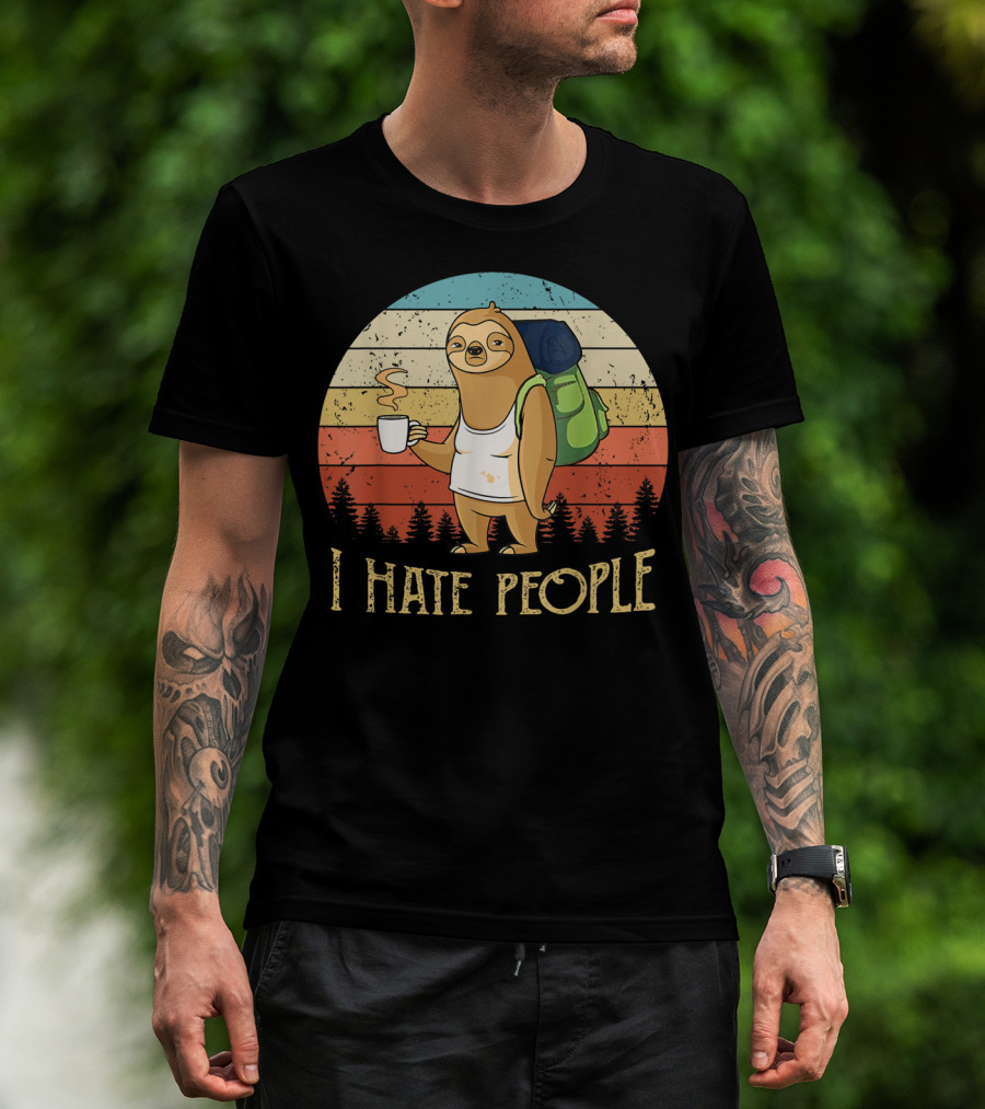 Vintage I Hate People Sloth Camping With Coffee And Backpack Retro Sunset Stripes T-Shirt