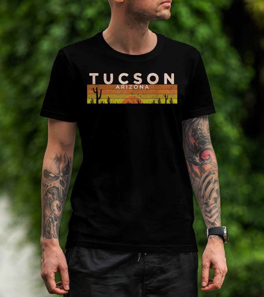 The Tucson Arizona Desert Sunset Cactus Vintage Retro Stripes T-shirt is designed for everyday wear and a consistent fit. Fabric is pre-shrunk ring-spun cotton with durable stitching. See the size chart below for exact measurements.
