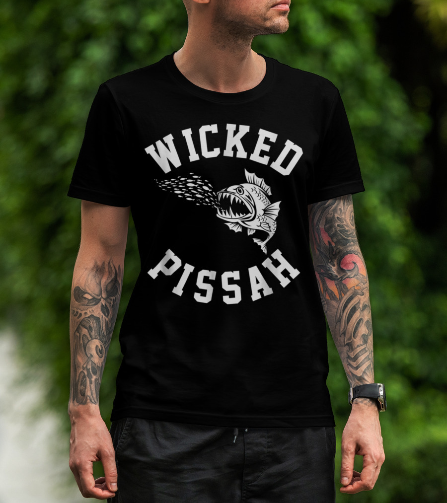 The Wicked Pissah Funny Boston Slang Fish T-shirt is designed for everyday wear and a consistent fit. Fabric is pre-shrunk ring-spun cotton with durable stitching. See the size chart below for exact measurements.