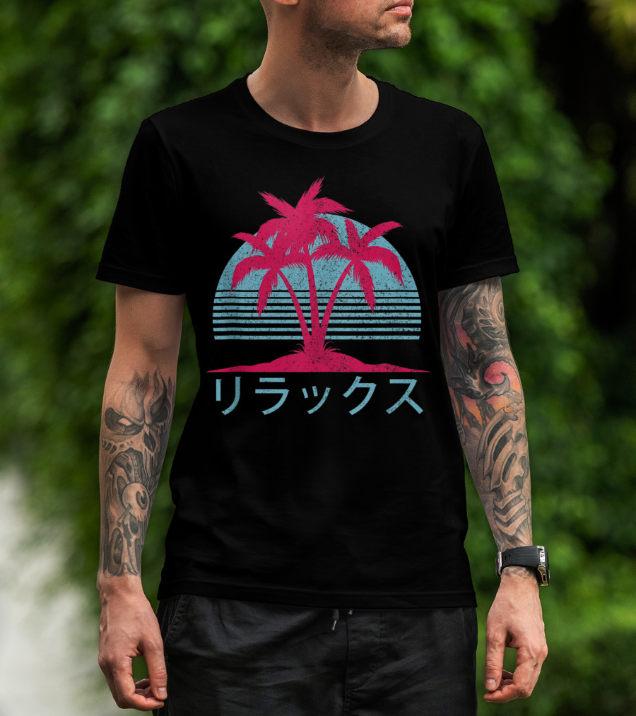 The Vaporwave Vintage Japanese Palm Trees Summer T-shirt is designed for everyday wear and a consistent fit. Fabric is pre-shrunk ring-spun cotton with durable stitching. See the size chart below for exact measurements.