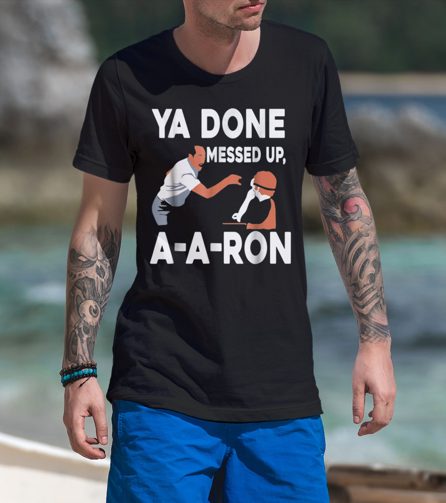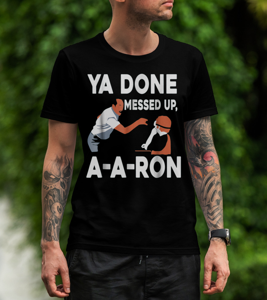 The Ya Done Messed Up A-A-Ron T-shirt is designed for everyday wear and a consistent fit. Fabric is pre-shrunk ring-spun cotton with durable stitching. See the size chart below for exact measurements.