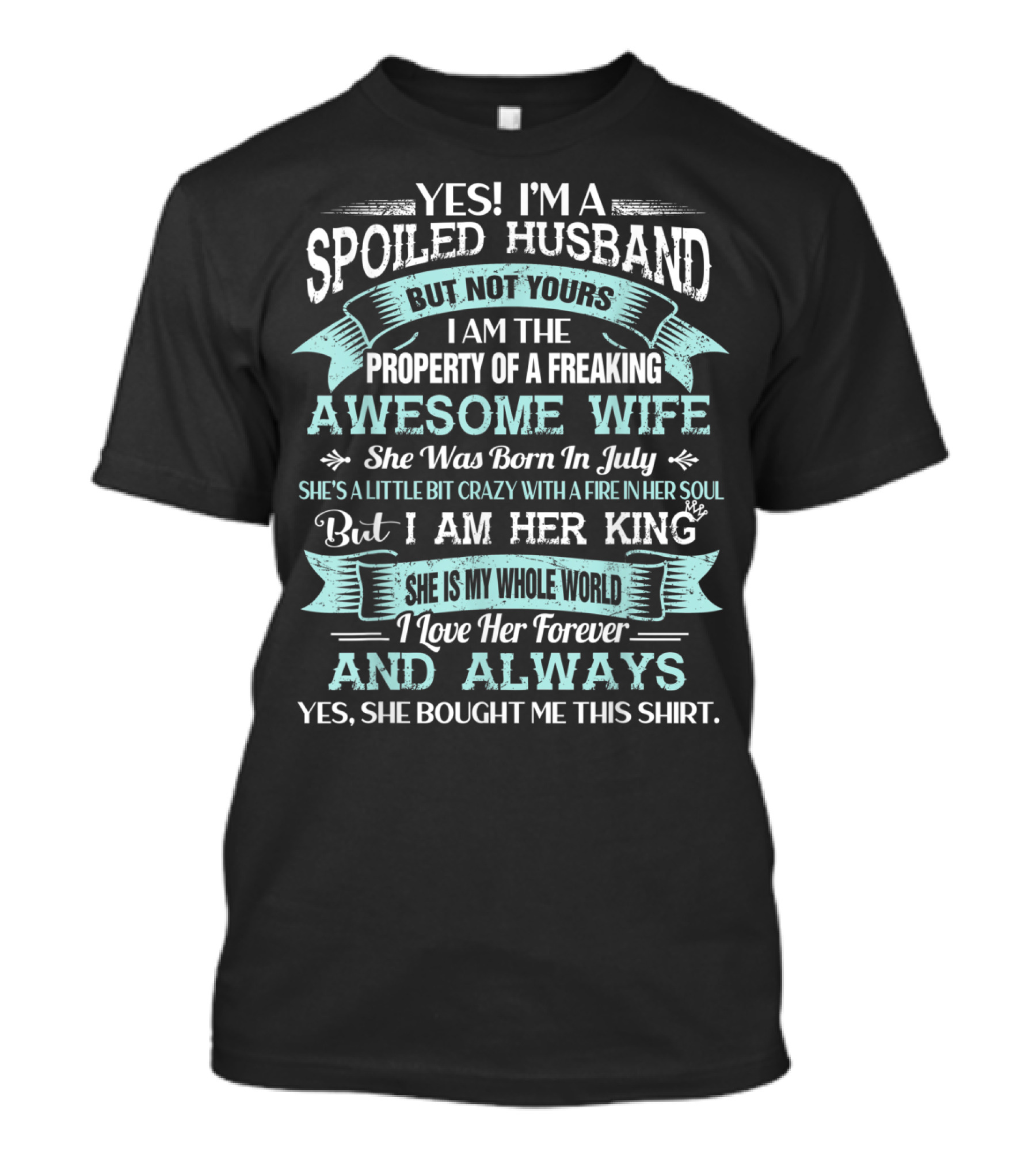 Yes I'm A Spoiled Husband But Not Yours Property Of A Freaking Awesome Wife Born In July Little Bit Crazy Fire In Her Soul I Am Her King She Is My Whole World Love Her Forever T-Shirt