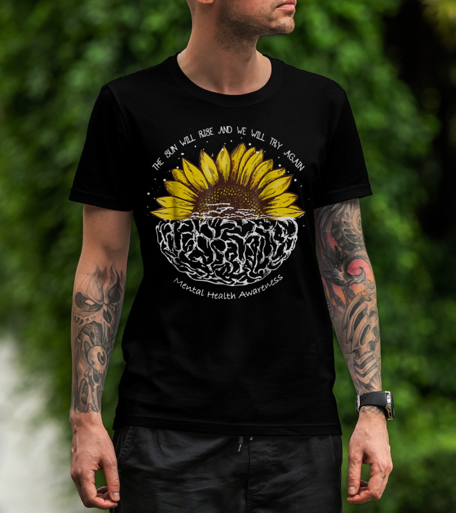 The Sun Will Rise And We Will Try Again Mental Health Awareness Sunflower Brain T-Shirt