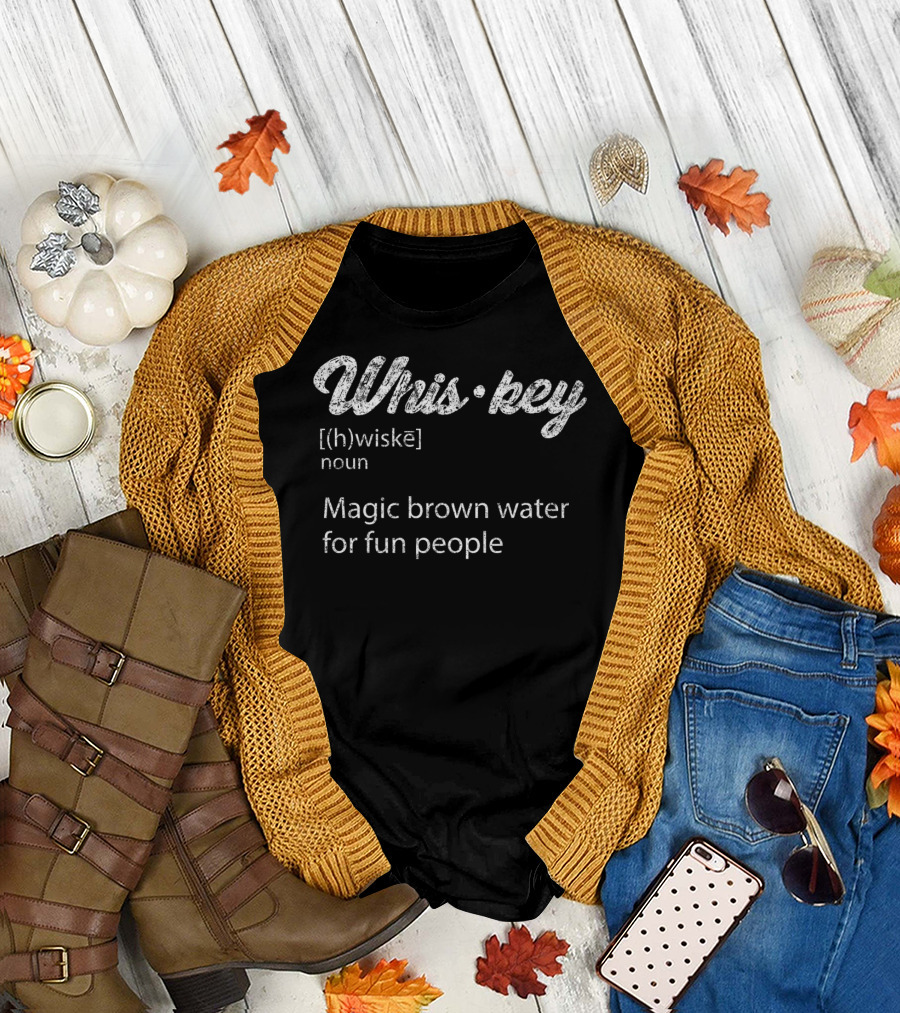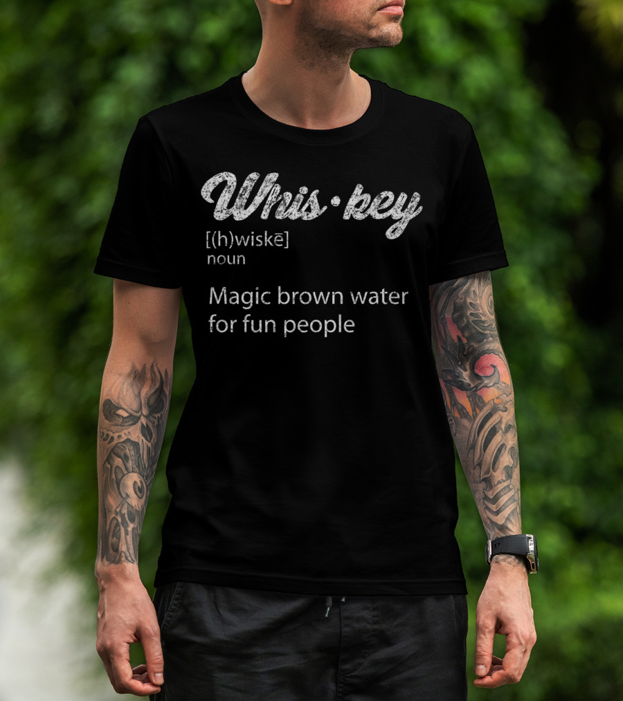 The Whiskey Definition Magic Brown Water for Fun People Drinking Bartender Distress T-shirt is designed for everyday wear and a consistent fit. Fabric is pre-shrunk ring-spun cotton with durable stitching. See the size chart below for exact measurements.