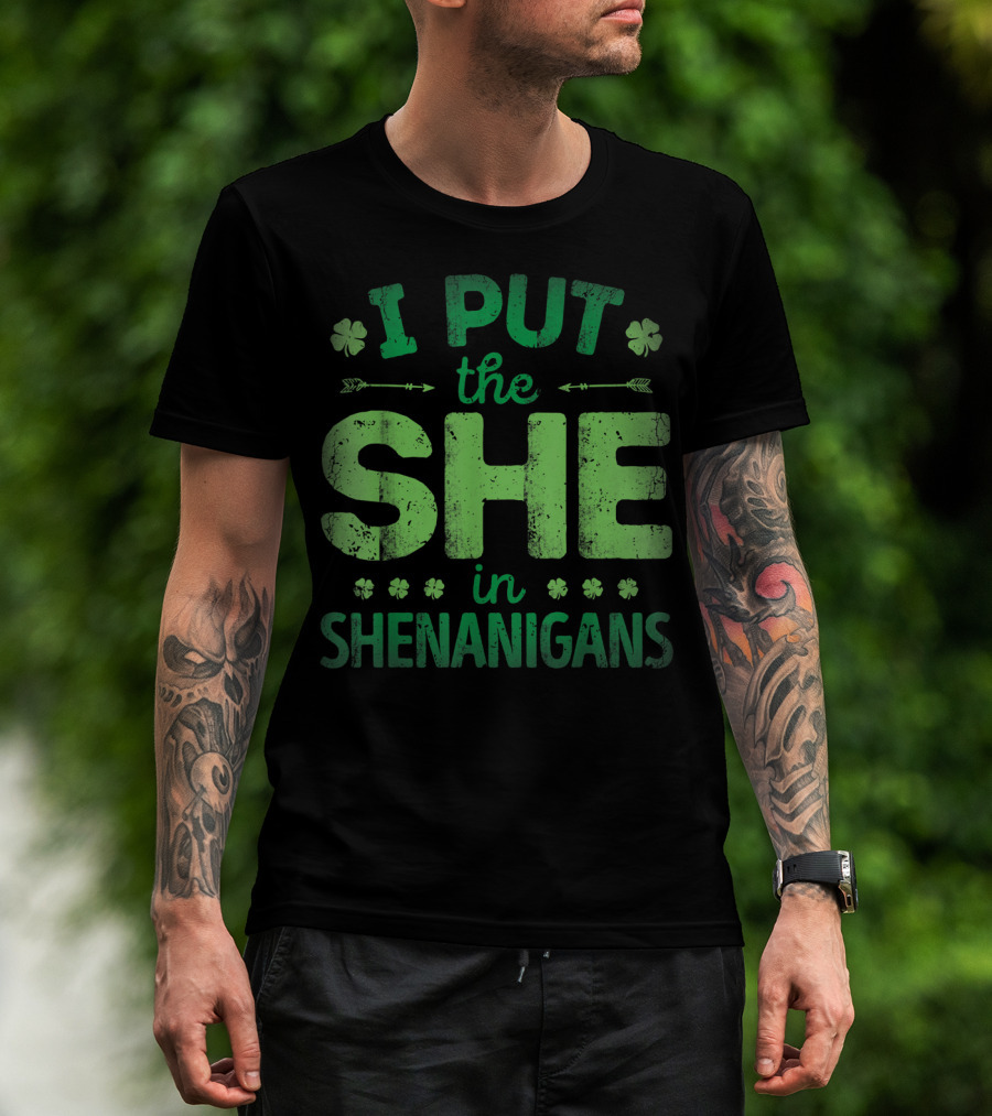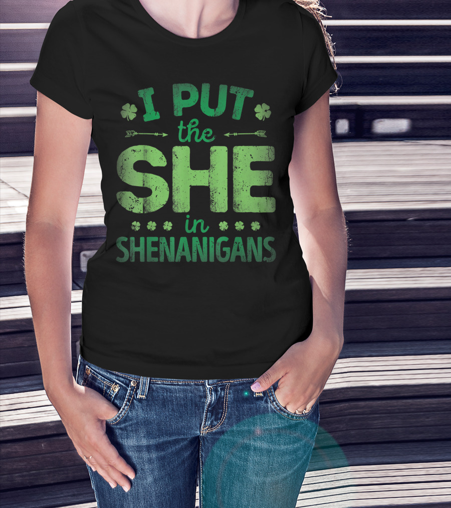 I Put The She In Shenanigans Clover Pattern Green Text T-Shirt
