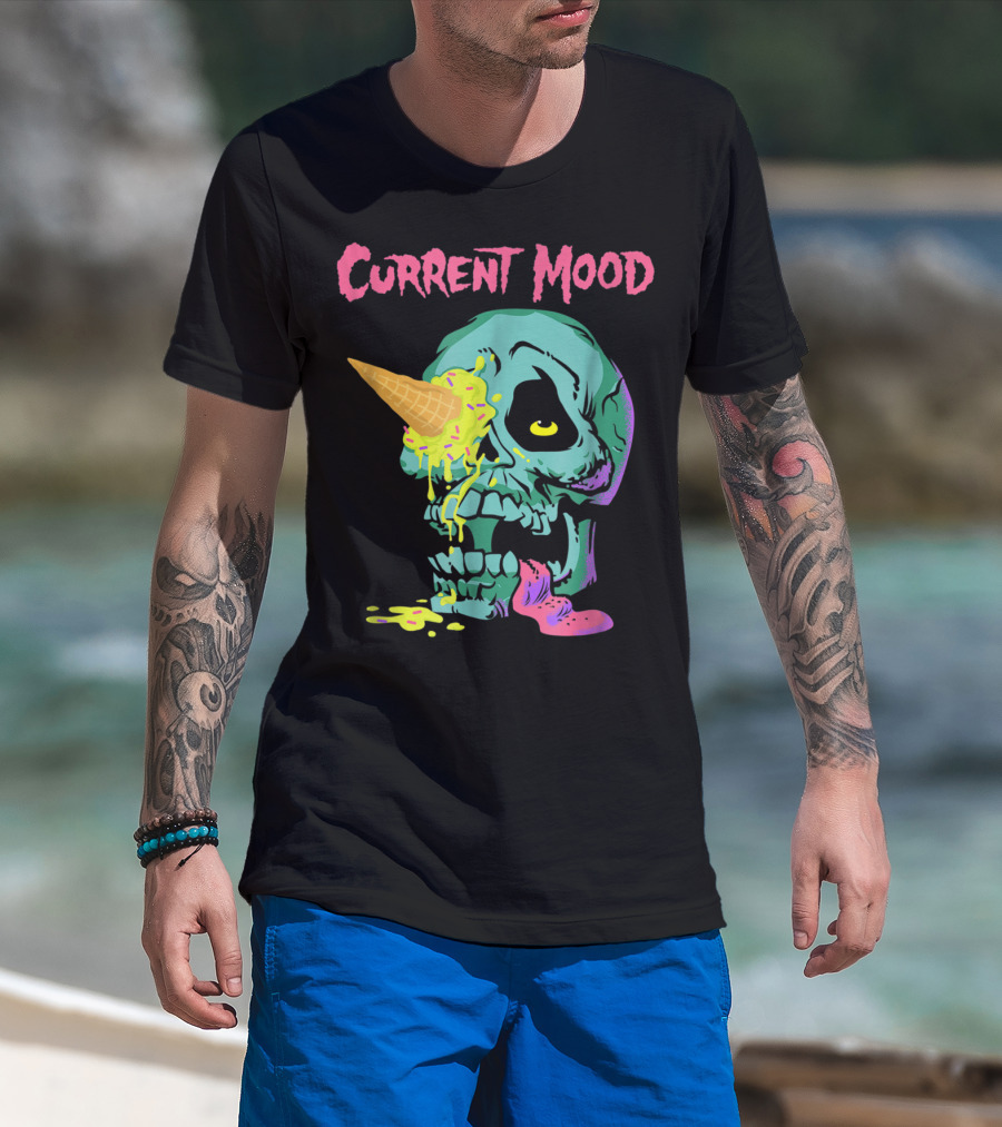 The Current Mood Ice Cream Skull T-shirt is designed for everyday wear and a consistent fit. Fabric is pre-shrunk ring-spun cotton with durable stitching. See the size chart below for exact measurements.