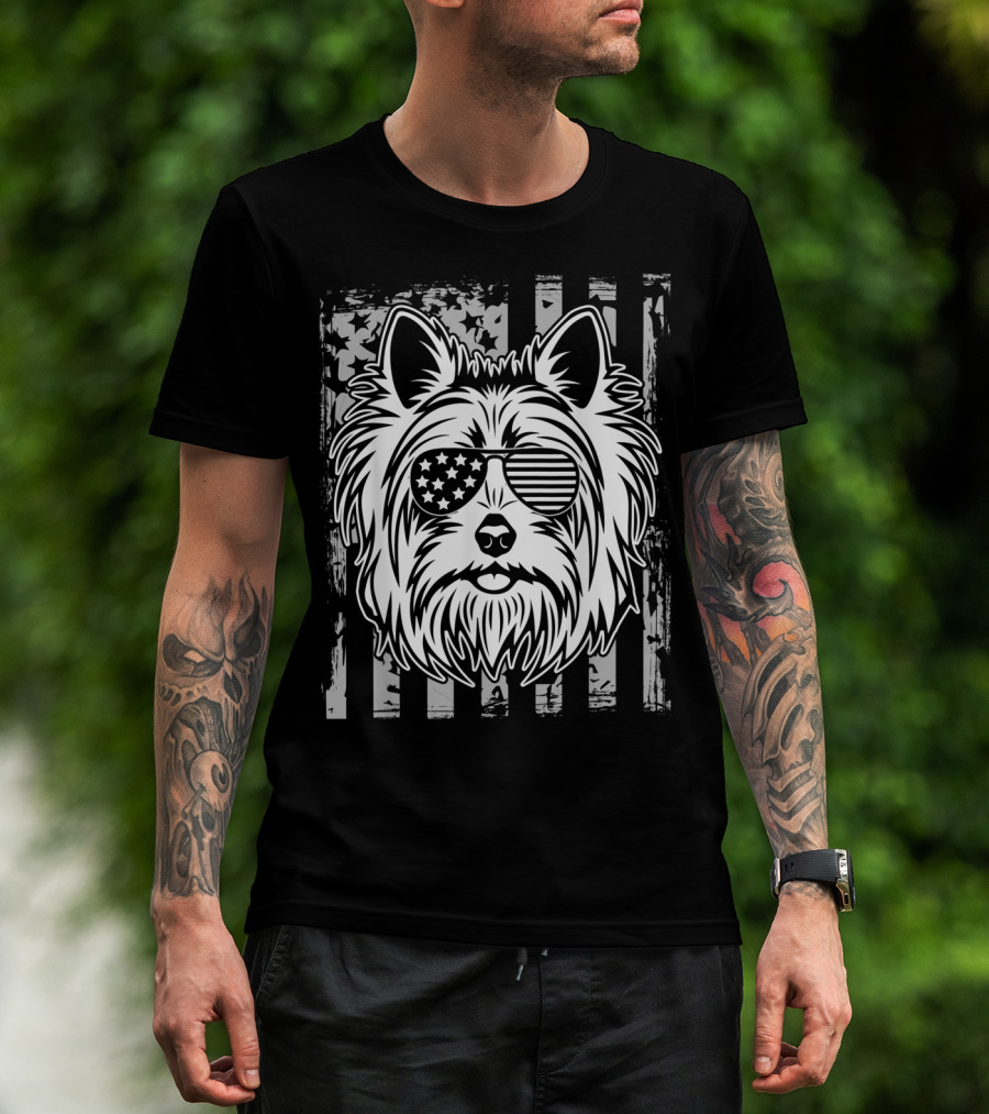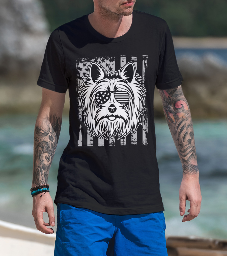 Vintage US Flag Sunglasses Yorkshire Terrier Face On Black Grunge Flag Background T-Shirt