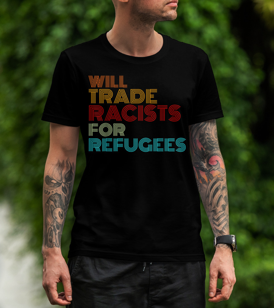 How much will this Will Trade Racists For Refugees Political Message shirt shrink?