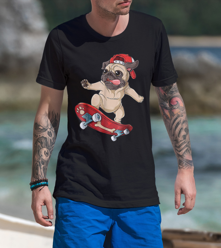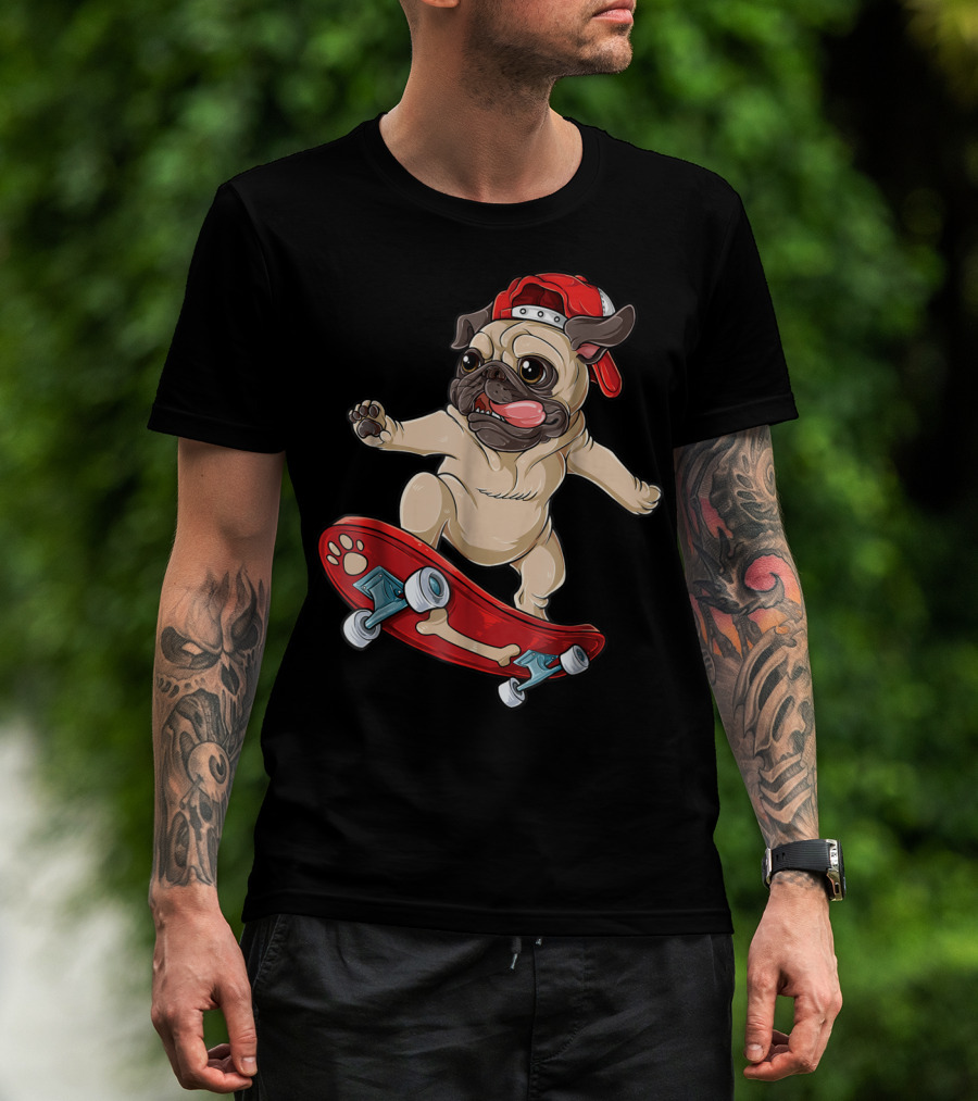 The Pug Puppy Skater with Red Hat and Paw Print Skateboard T-shirt is designed for everyday wear and a consistent fit. Fabric is pre-shrunk ring-spun cotton with durable stitching. See the size chart below for exact measurements.