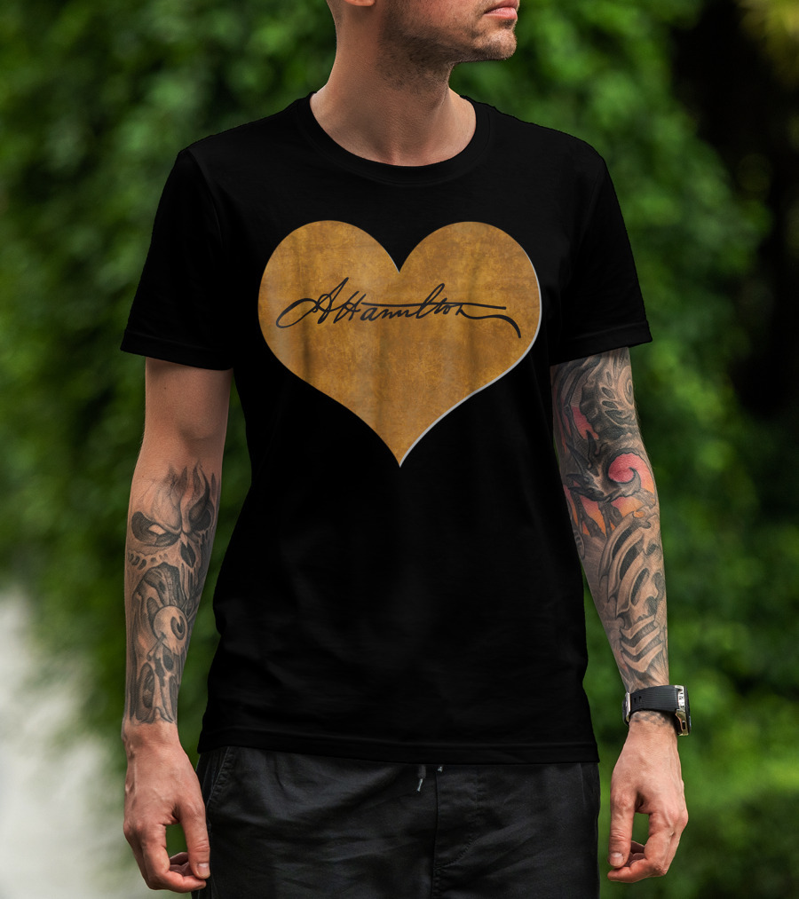 The Alexander Hamilton Heart Signature T-shirt is designed for everyday wear and a consistent fit. Fabric is pre-shrunk ring-spun cotton with durable stitching. See the size chart below for exact measurements.