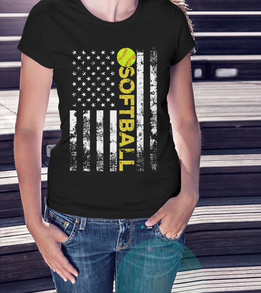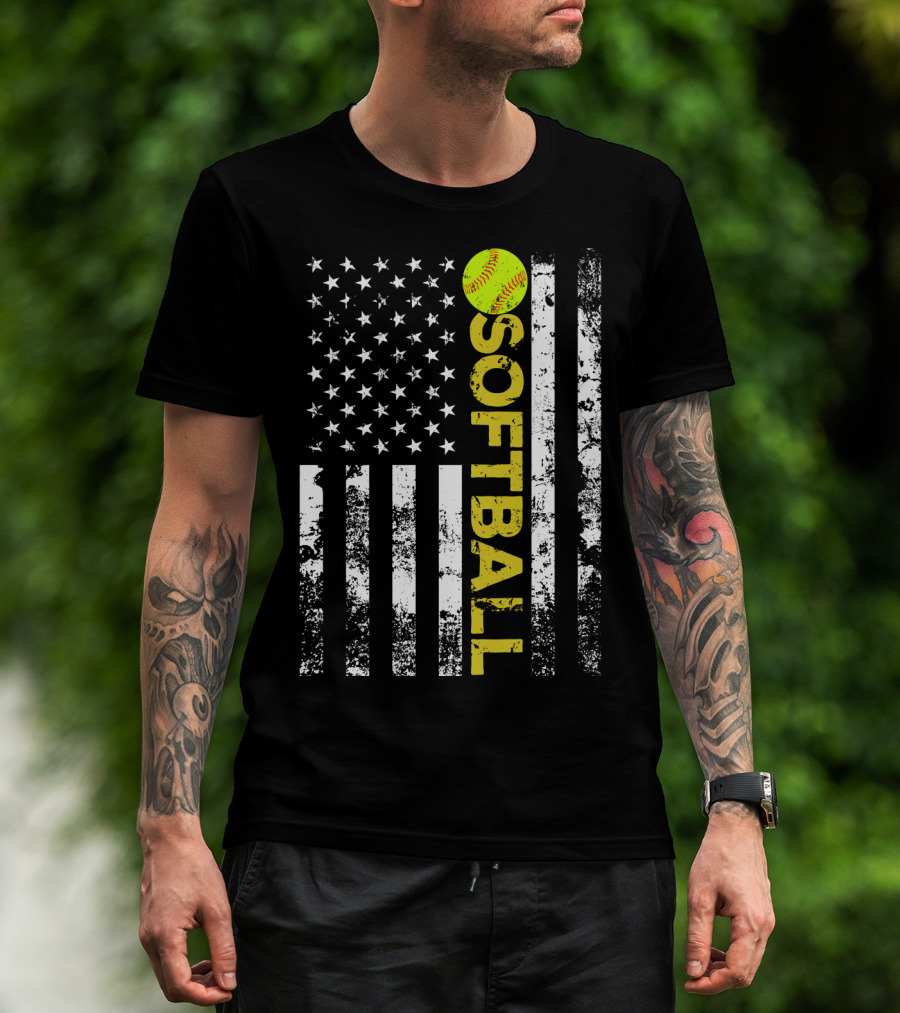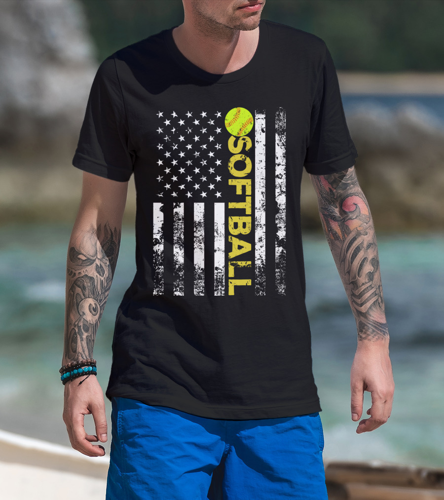 American Flag Softball Vertical Text With Yellow Softball T-Shirt
