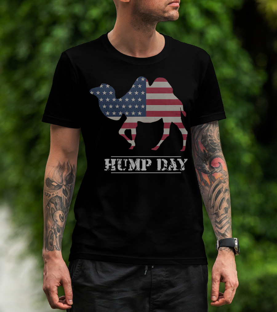 The Hump Day American Flag Camel Funny T-shirt is designed for everyday wear and a consistent fit. Fabric is pre-shrunk ring-spun cotton with durable stitching. See the size chart below for exact measurements.