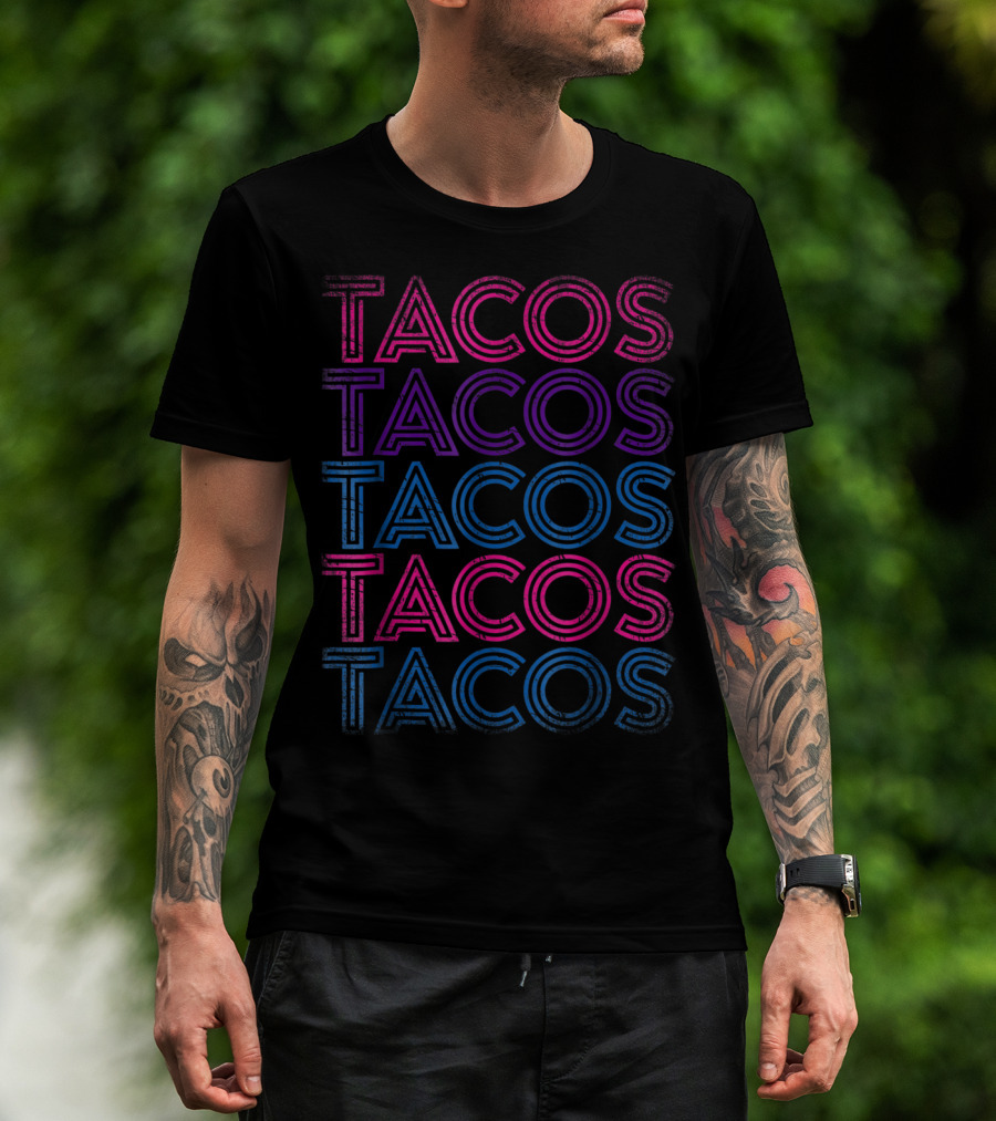 The Tacos Tacos Tacos Tacos Tacos Retro Tacos Vintage Taco Tuesday Mexican T-shirt is designed for everyday wear and a consistent fit. Fabric is pre-shrunk ring-spun cotton with durable stitching. See the size chart below for exact measurements.