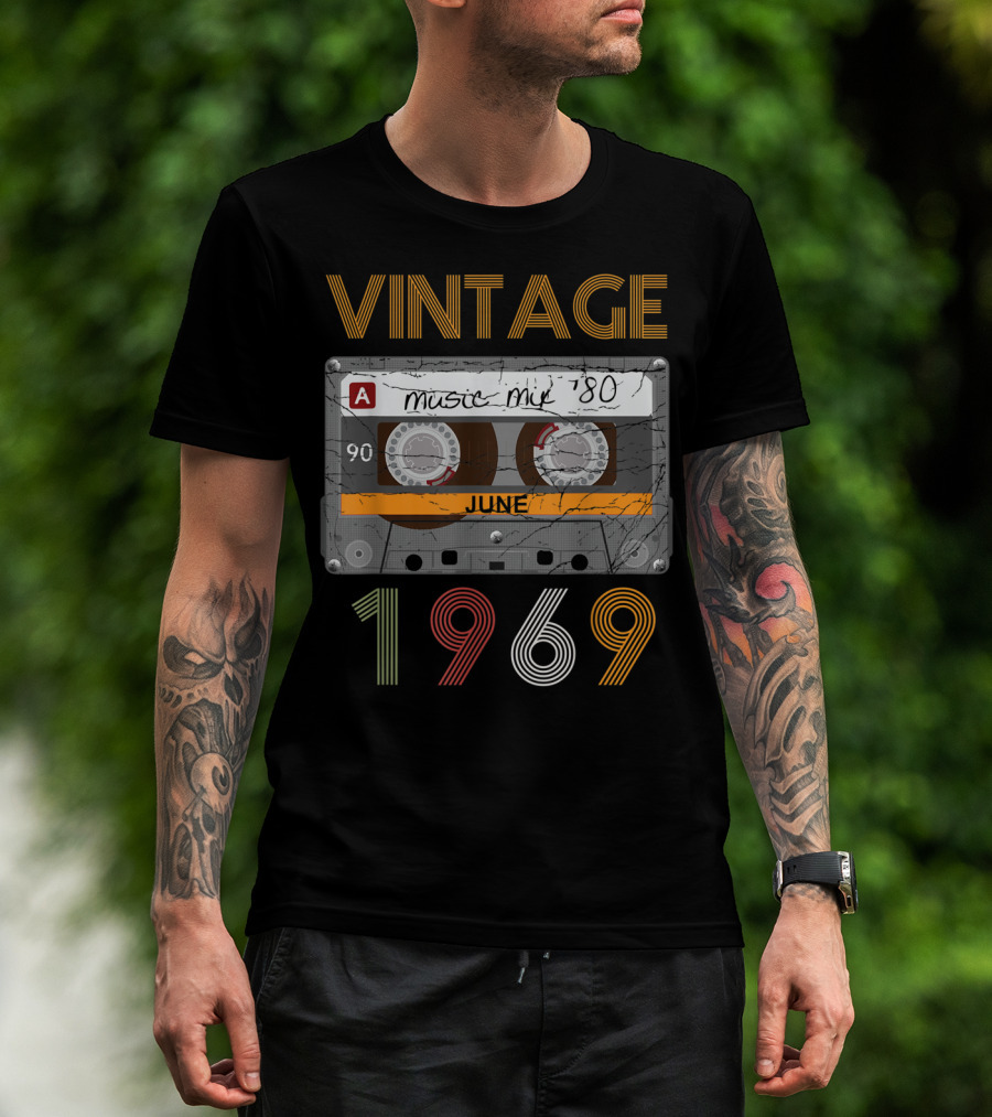 The Vintage Music Mix Cassette June 1969 T-shirt is designed for everyday wear and a consistent fit. Fabric is pre-shrunk ring-spun cotton with durable stitching. See the size chart below for exact measurements.