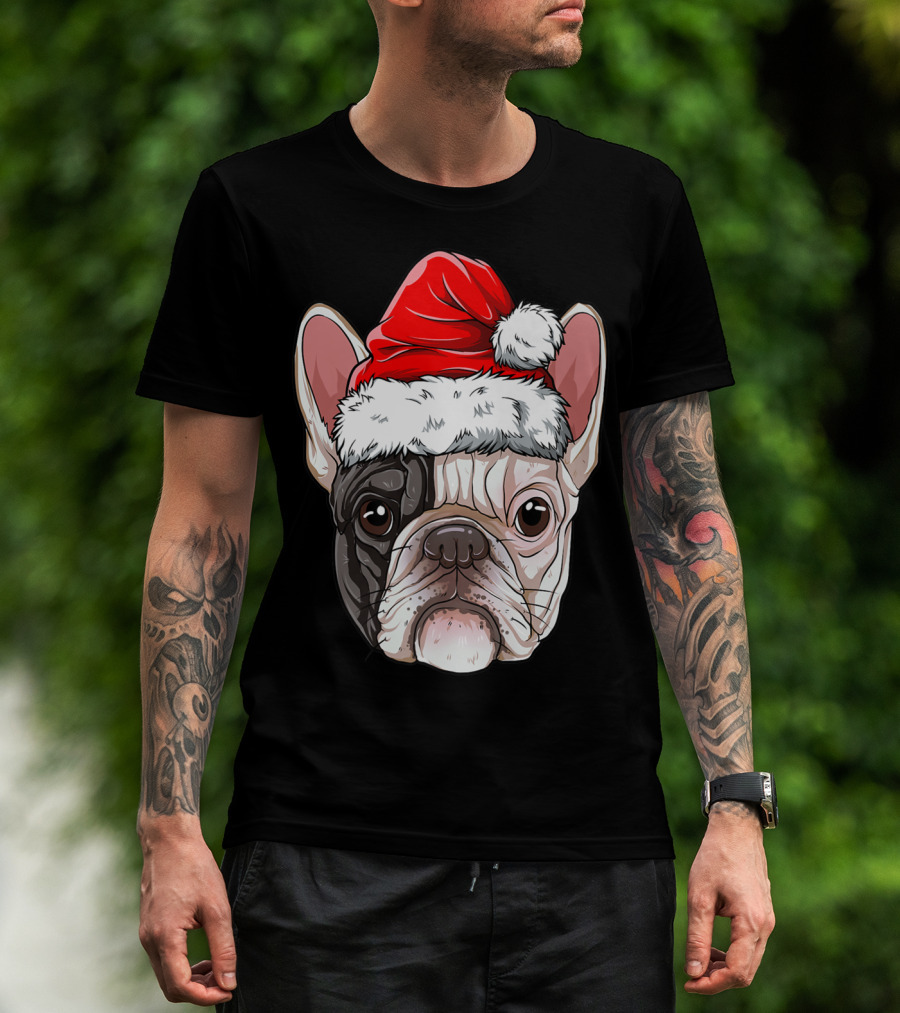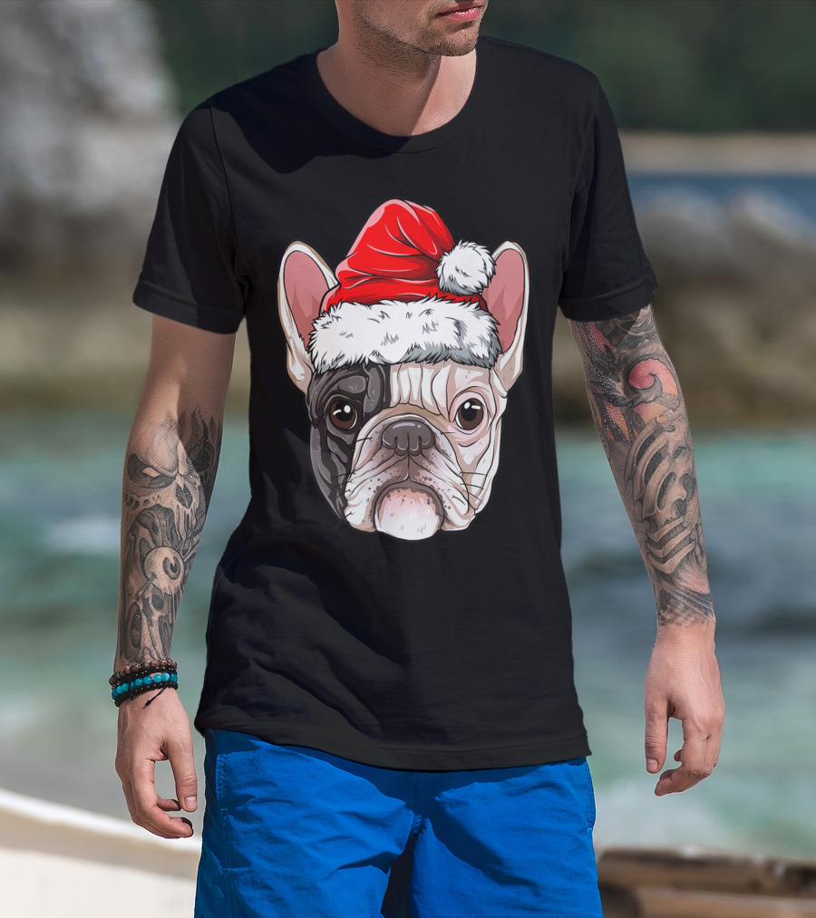 The French Bulldog Wearing Santa Hat T-shirt is designed for everyday wear and a consistent fit. Fabric is pre-shrunk ring-spun cotton with durable stitching. See the size chart below for exact measurements.