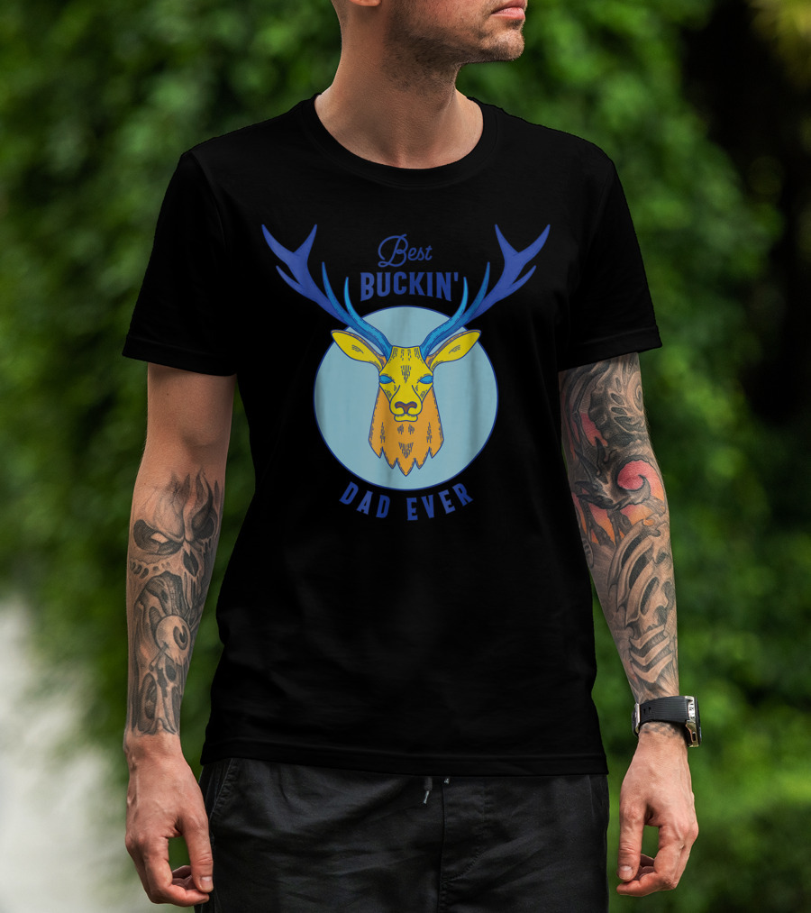 Best Buckin' Dad Ever Deer Hunting Stag Head Blue And Yellow Circle T-Shirt
