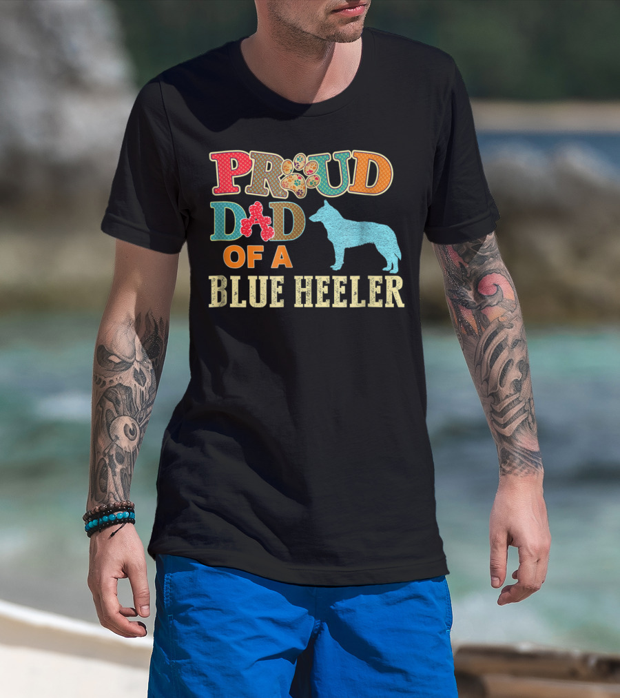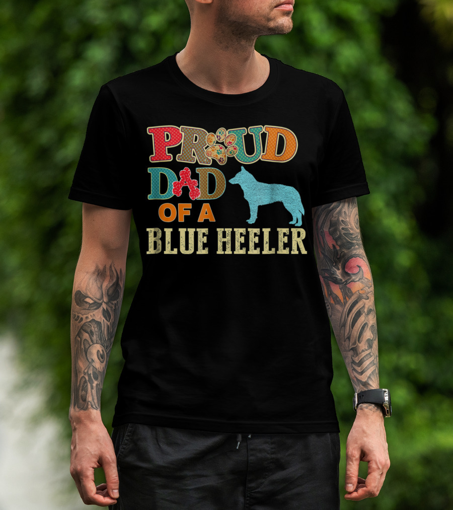 The Proud Dad of a Blue Heeler T-shirt is designed for everyday wear and a consistent fit. Fabric is pre-shrunk ring-spun cotton with durable stitching. See the size chart below for exact measurements.