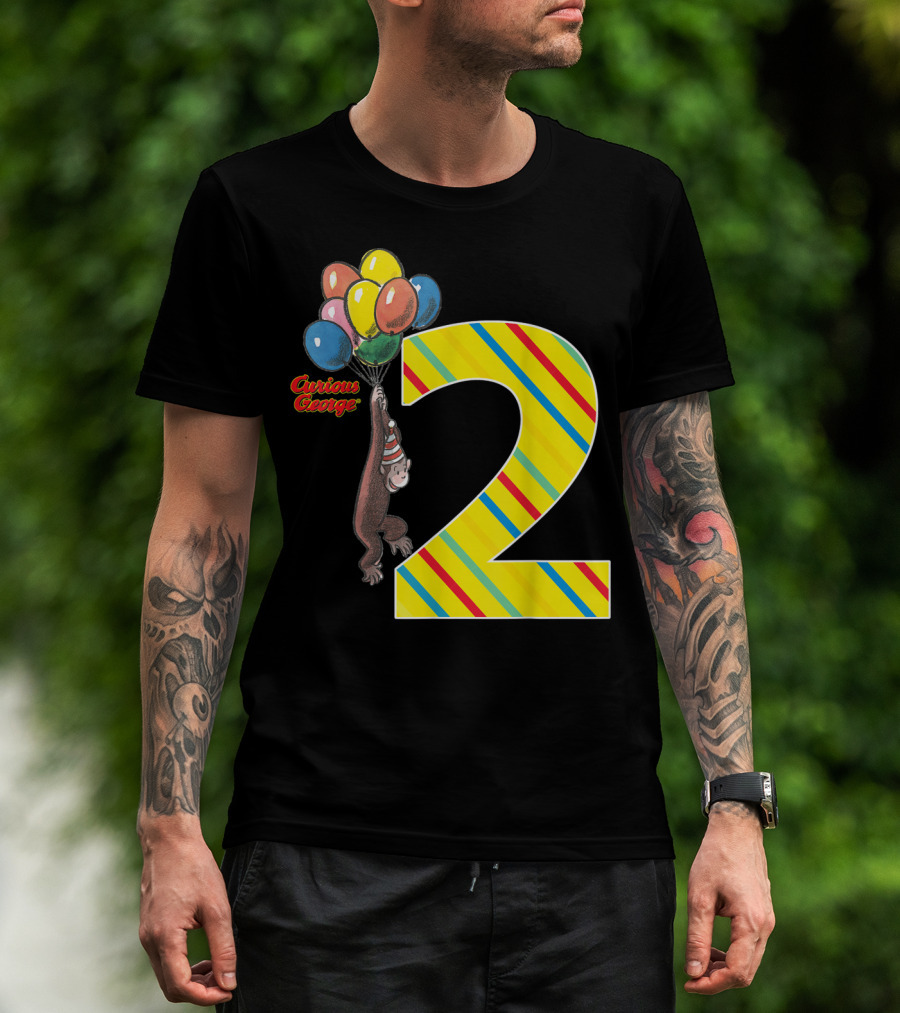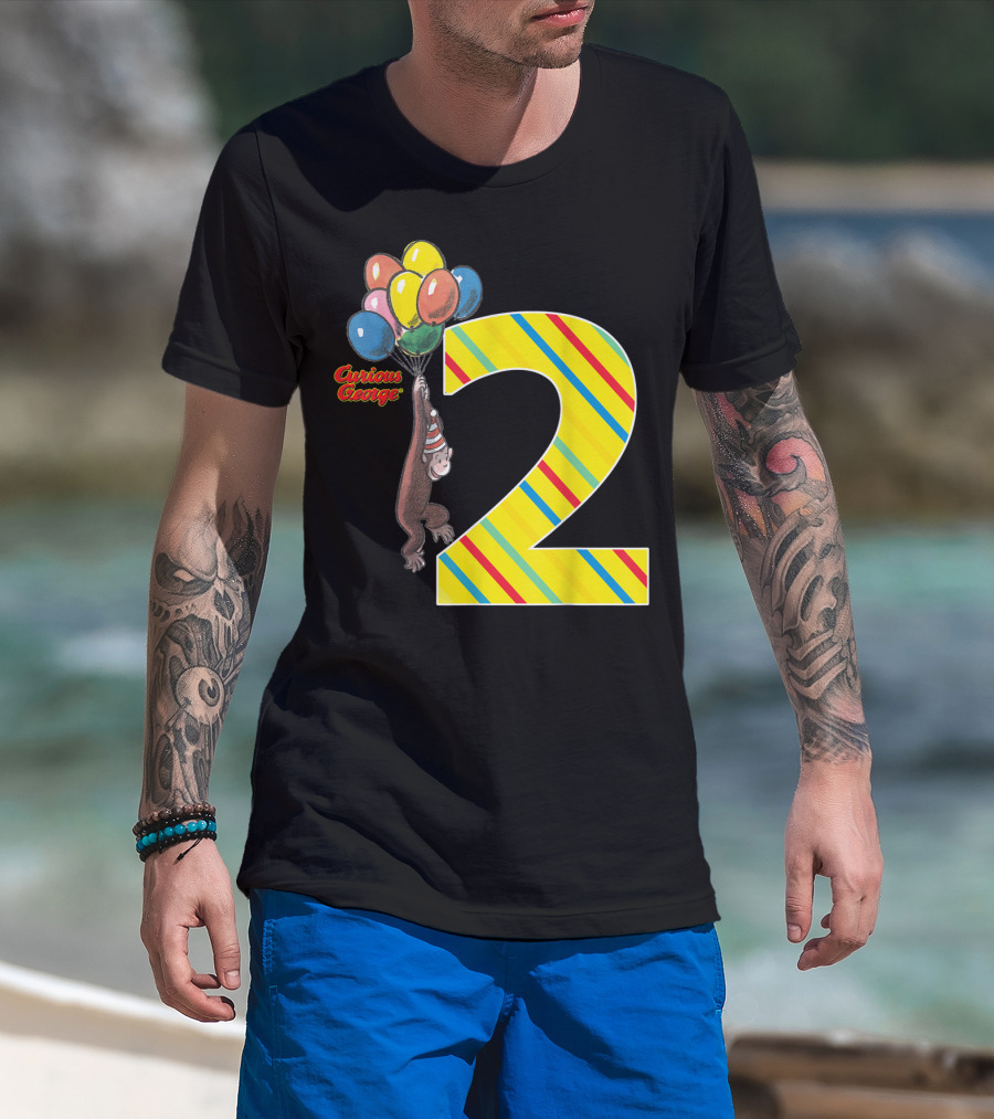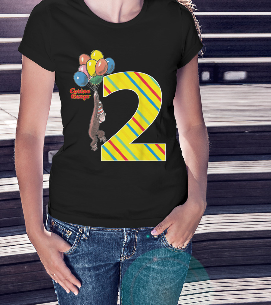 Curious George Holding Balloons Next To Colorful Striped Number 2 For Second Birthday T-Shirt