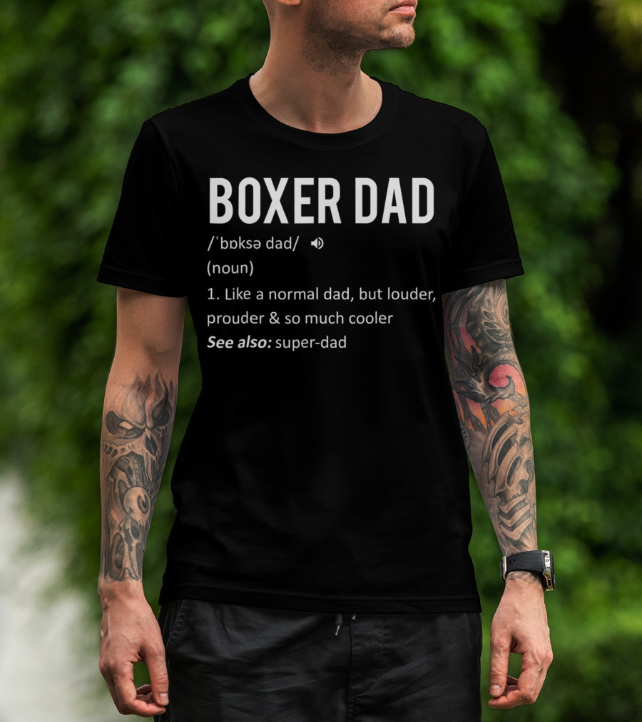 The Boxer Dad from Daughter Son51 Like a Normal Dad but Louder Prouder Cooler Super-Dad T-shirt is designed for everyday wear and a consistent fit. Fabric is pre-shrunk ring-spun cotton with durable stitching. See the size chart below for exact measurements.