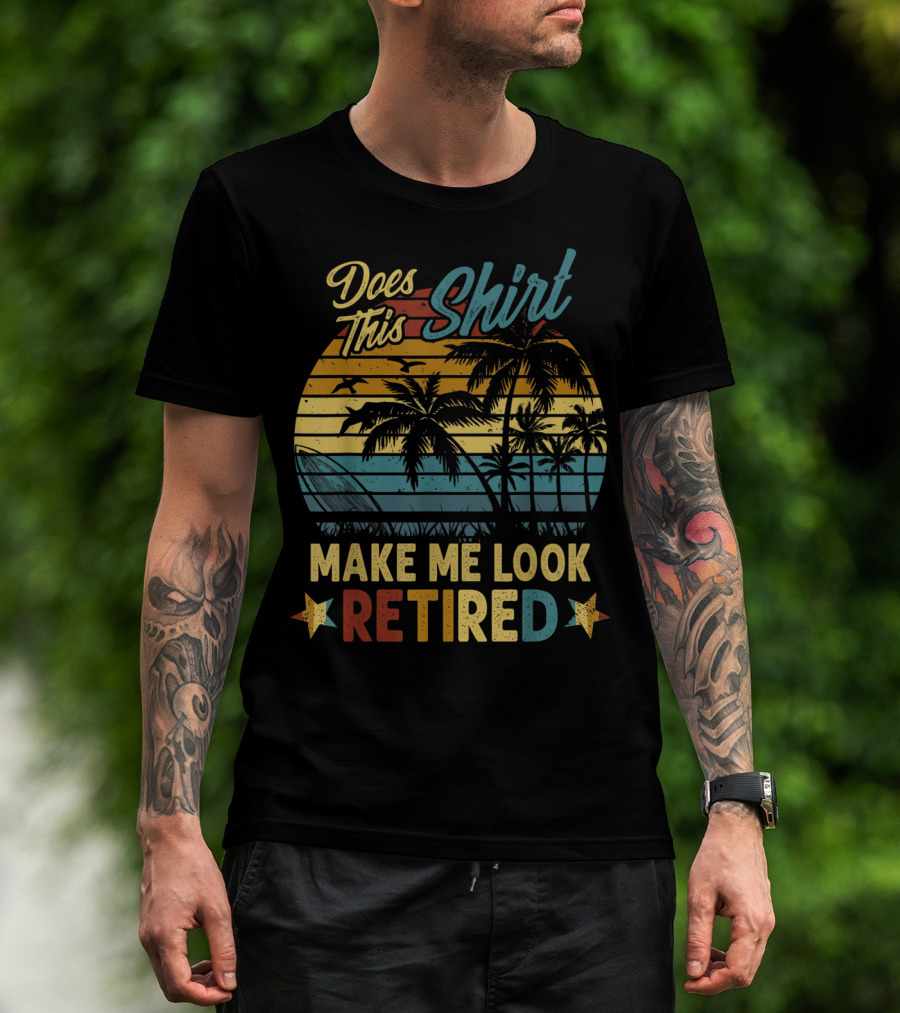 The Does This Shirt Make Me Look Retired Retro Palm Beach Sunset T-shirt is designed for everyday wear and a consistent fit. Fabric is pre-shrunk ring-spun cotton with durable stitching. See the size chart below for exact measurements.