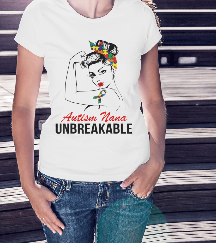 Autism Nana Unbreakable With Puzzle Ribbon And Rosie The Riveter T-Shirt