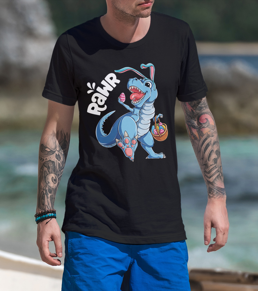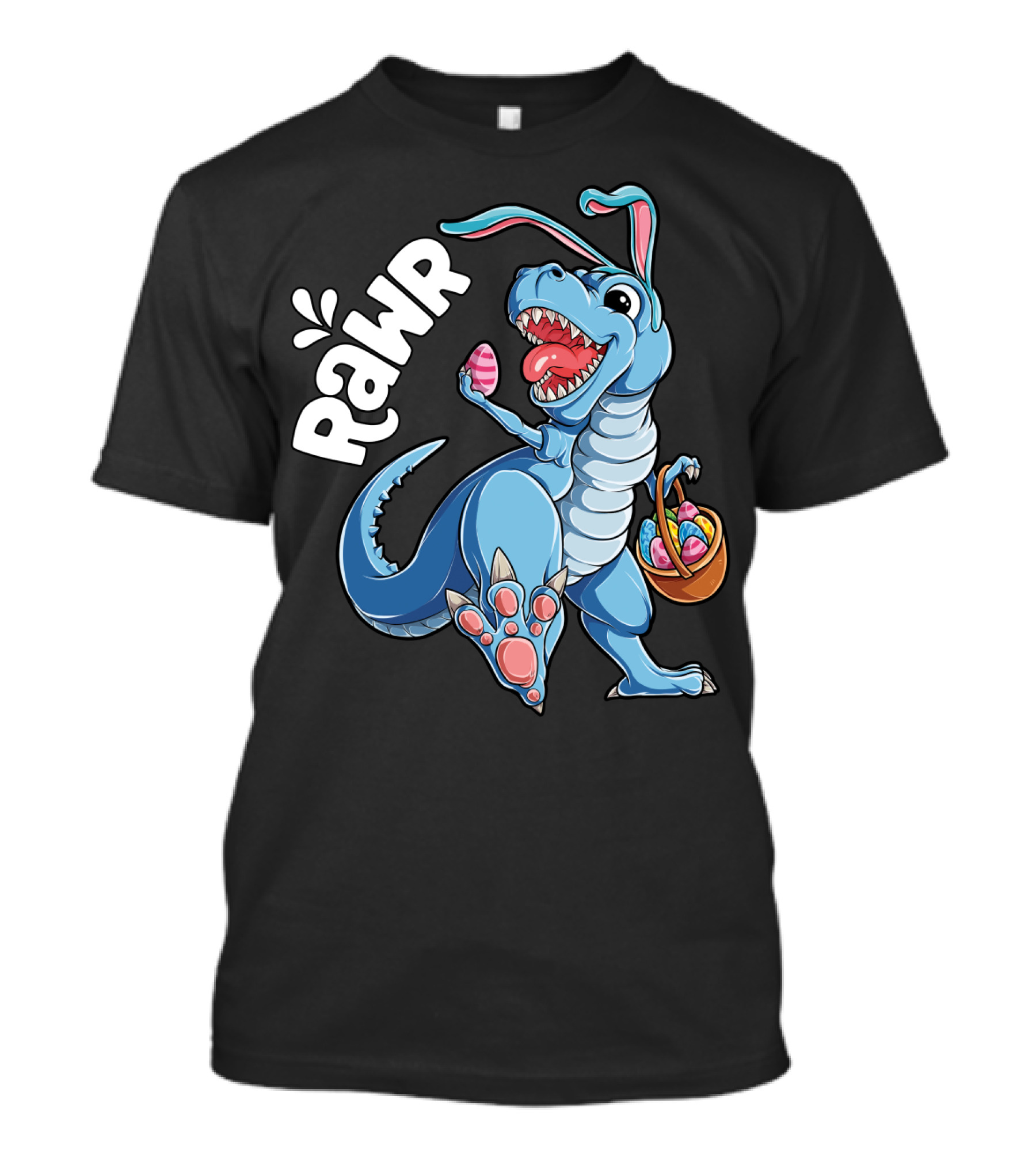 The Easter Bunny Dinosaur Rex RAWR Eggs Basket T-shirt is designed for everyday wear and a consistent fit. Fabric is pre-shrunk ring-spun cotton with durable stitching. See the size chart below for exact measurements.