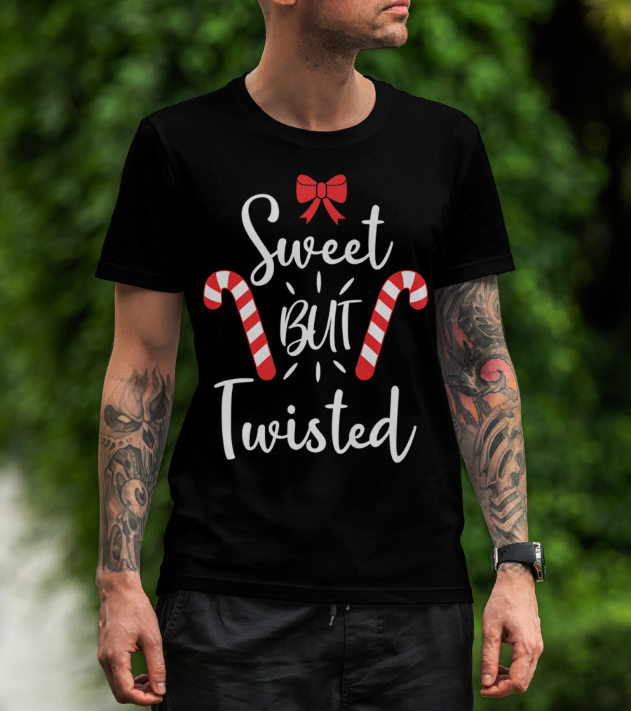 The Sweet But Twisted Christmas Candy Cane Bow T-shirt is designed for everyday wear and a consistent fit. Fabric is pre-shrunk ring-spun cotton with durable stitching. See the size chart below for exact measurements.