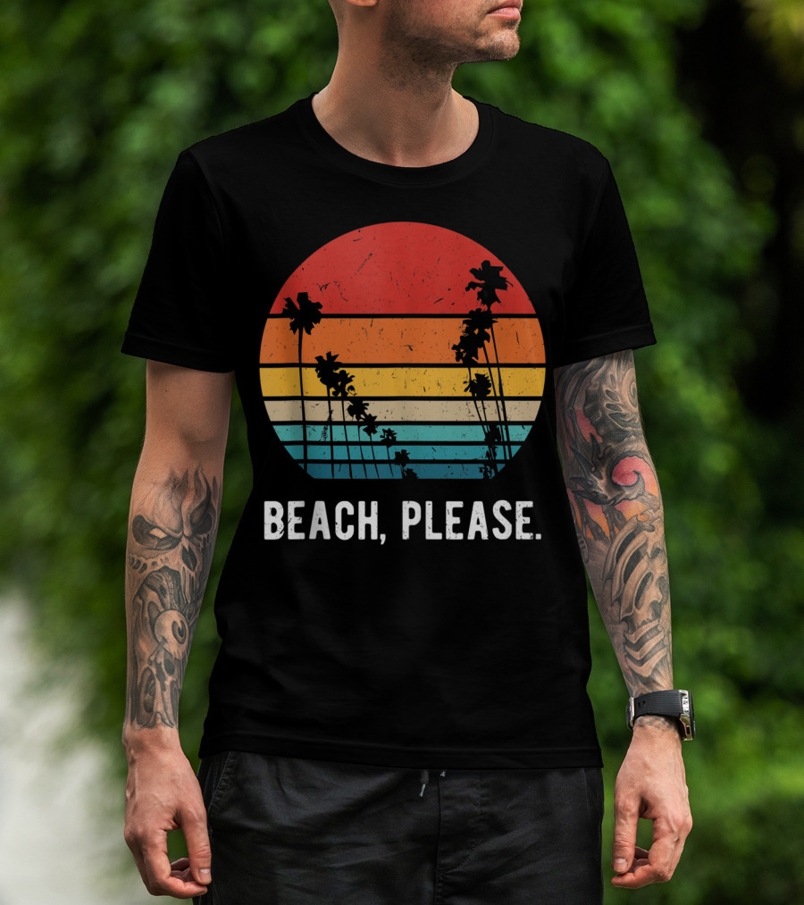 The Beach Please Summer Breaks Aloha Vintage Sunset Palm Trees T-shirt is designed for everyday wear and a consistent fit. Fabric is pre-shrunk ring-spun cotton with durable stitching. See the size chart below for exact measurements.