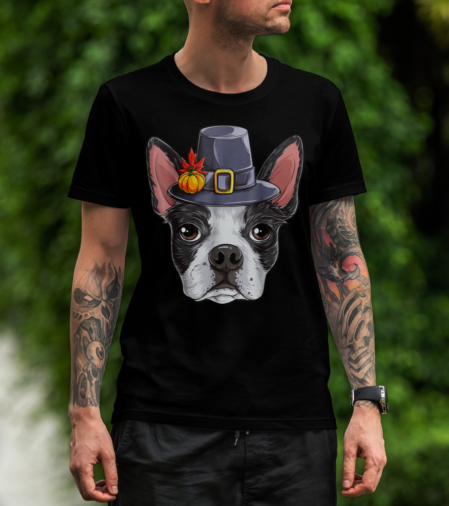 Thanksgiving Boston Terrier Pilgrim Hat Pumpkin T-Shirt