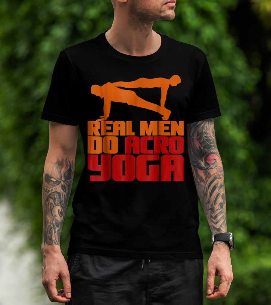The Real Men Do Acro Yoga T-shirt is designed for everyday wear and a consistent fit. Fabric is pre-shrunk ring-spun cotton with durable stitching. See the size chart below for exact measurements.