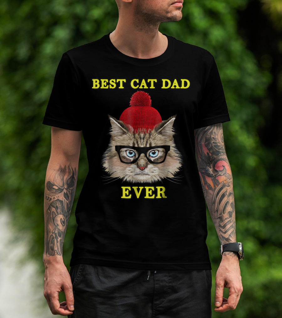 Best Cat Dad Ever Funny Pictoplast91 Red Beanie Glasses Cat T-Shirt