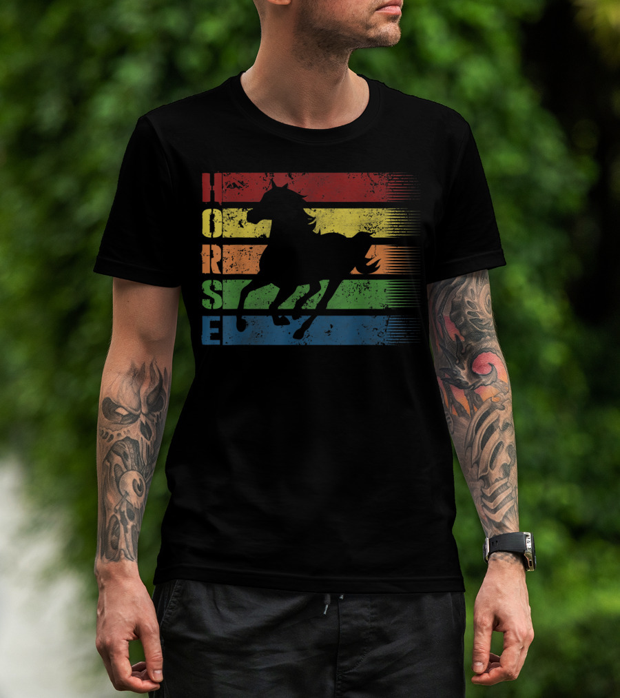 The Funny Horse Silhouette With Retro Stripes T-shirt is designed for everyday wear and a consistent fit. Fabric is pre-shrunk ring-spun cotton with durable stitching. See the size chart below for exact measurements.