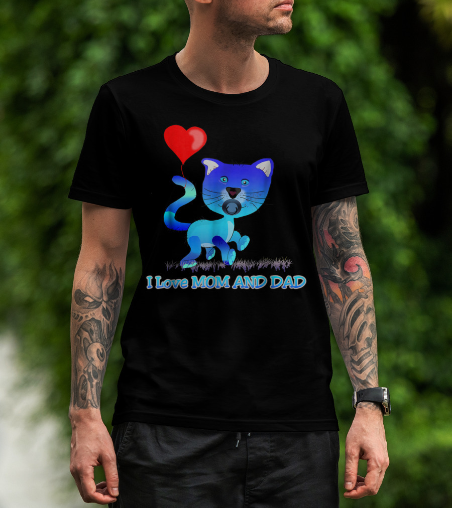 I Love Mom And Dad Cat With Heart Balloon Dummy Boy Kids Teens T-Shirt