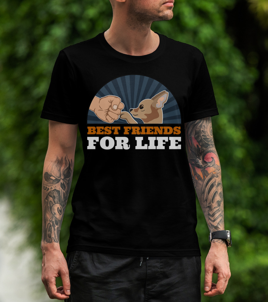The Best Friends For Life Chihuahua Dog Fist Bump T-shirt is designed for everyday wear and a consistent fit. Fabric is pre-shrunk ring-spun cotton with durable stitching. See the size chart below for exact measurements.