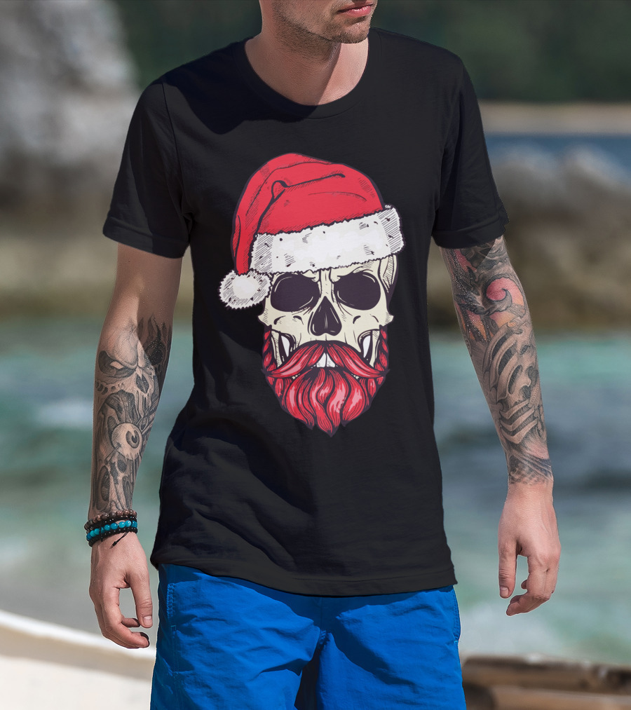 Vintage Bearded Skull Santa Claus With Red Hat And Mustache T-Shirt