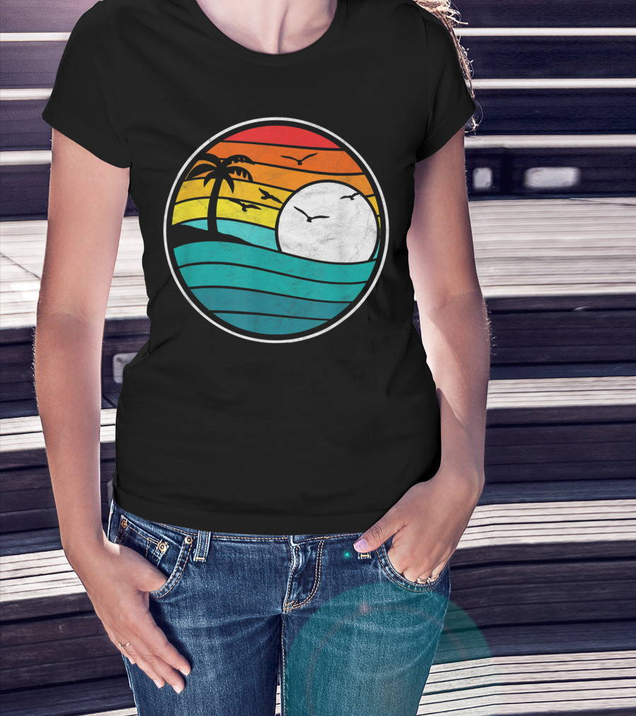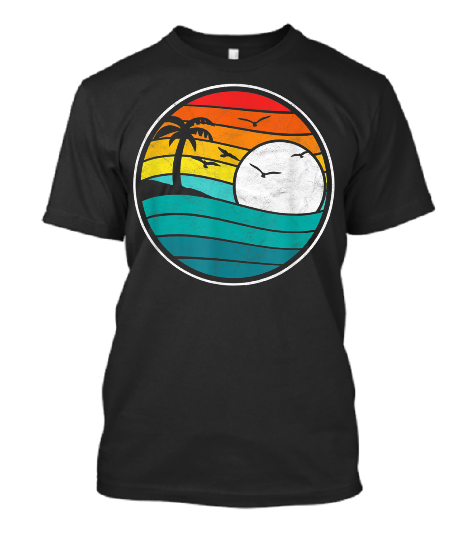 The Retro Eighties Beach Sunset Surf Palm Waves T-shirt is designed for everyday wear and a consistent fit. Fabric is pre-shrunk ring-spun cotton with durable stitching. See the size chart below for exact measurements.