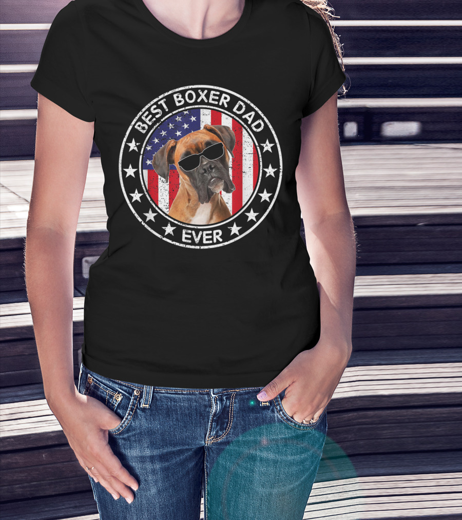 Best Boxer Dad Ever American Flag With Cool Sunglasses Dog T-Shirt