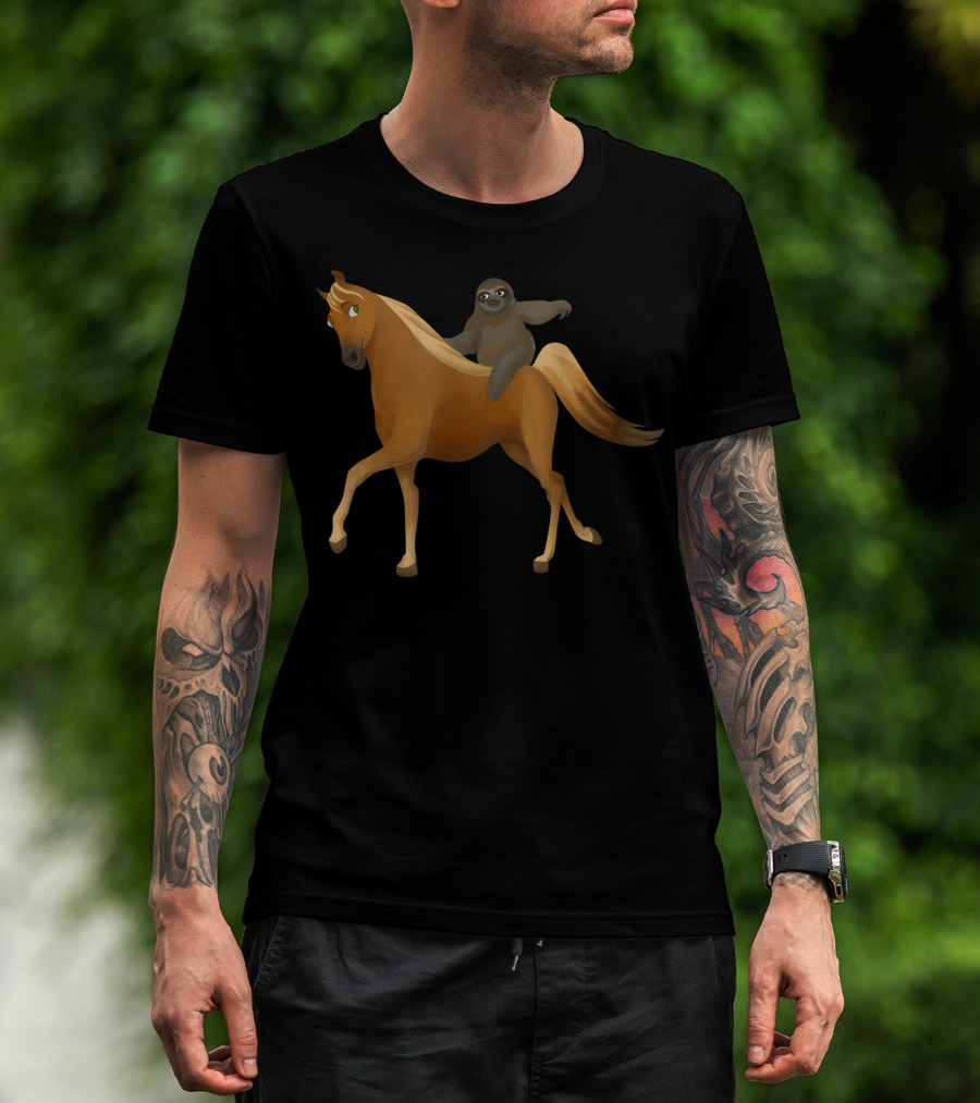 The Funny Sloth Riding Horse Pony T-shirt is designed for everyday wear and a consistent fit. Fabric is pre-shrunk ring-spun cotton with durable stitching. See the size chart below for exact measurements.
