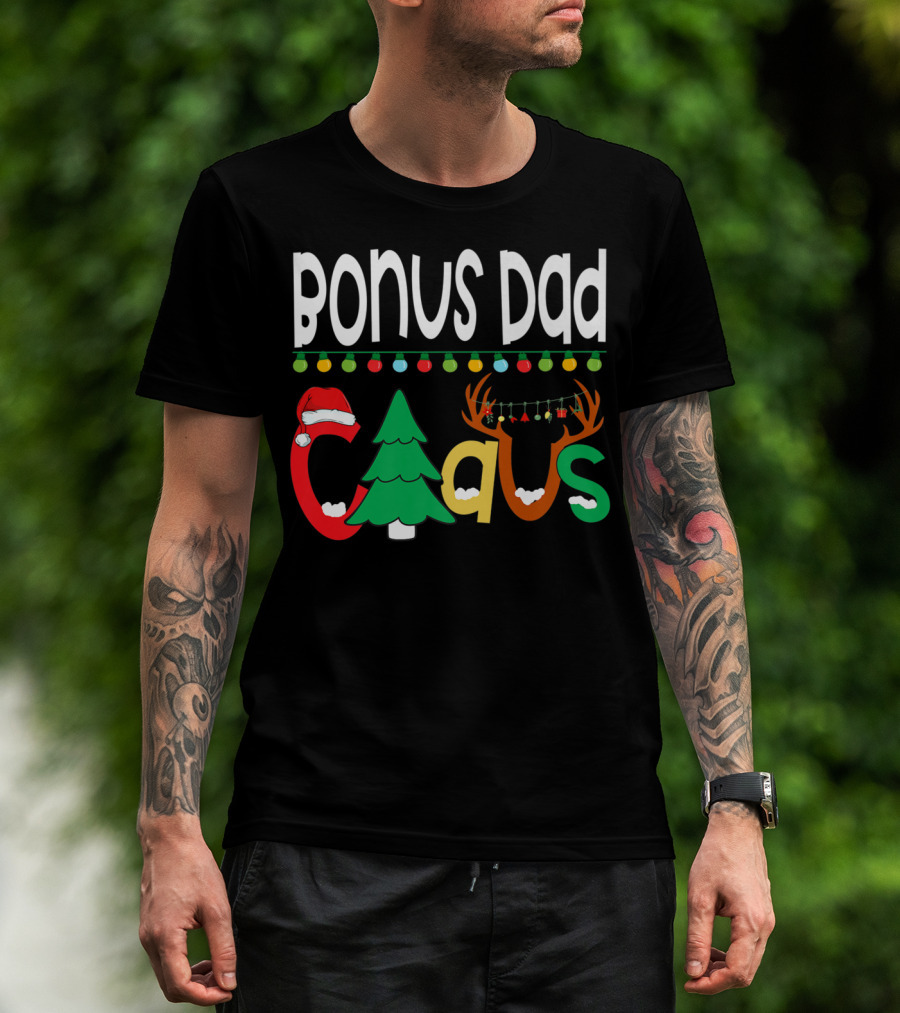 Bonus Dad Claus Christmas Lights Santa Hat Tree Reindeer Antlers T-Shirt