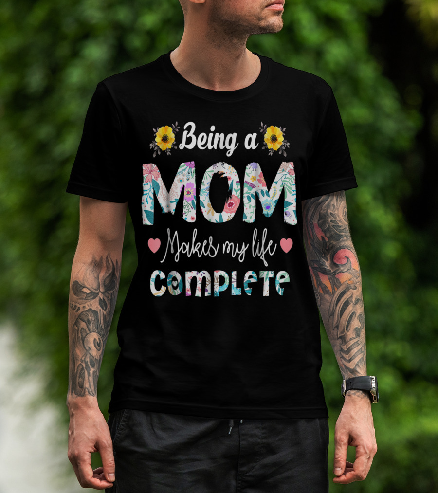 Being A Mom Makes My Life Complete Floral Text With Yellow Flowers And Hearts T-Shirt