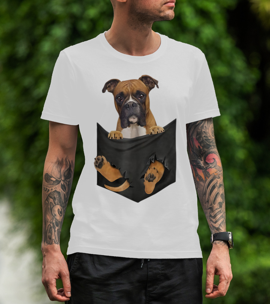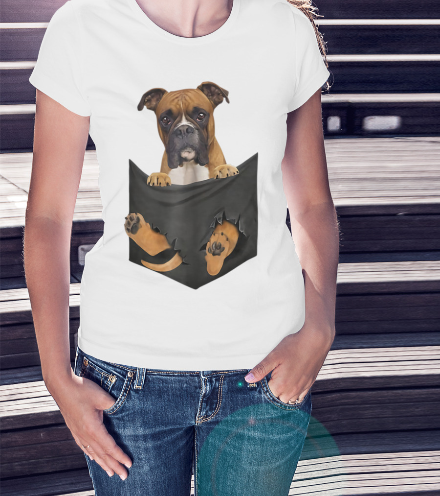 The Boxer Puppy In Pocket Boxer Lover T-shirt is designed for everyday wear and a consistent fit. Fabric is pre-shrunk ring-spun cotton with durable stitching. See the size chart below for exact measurements.