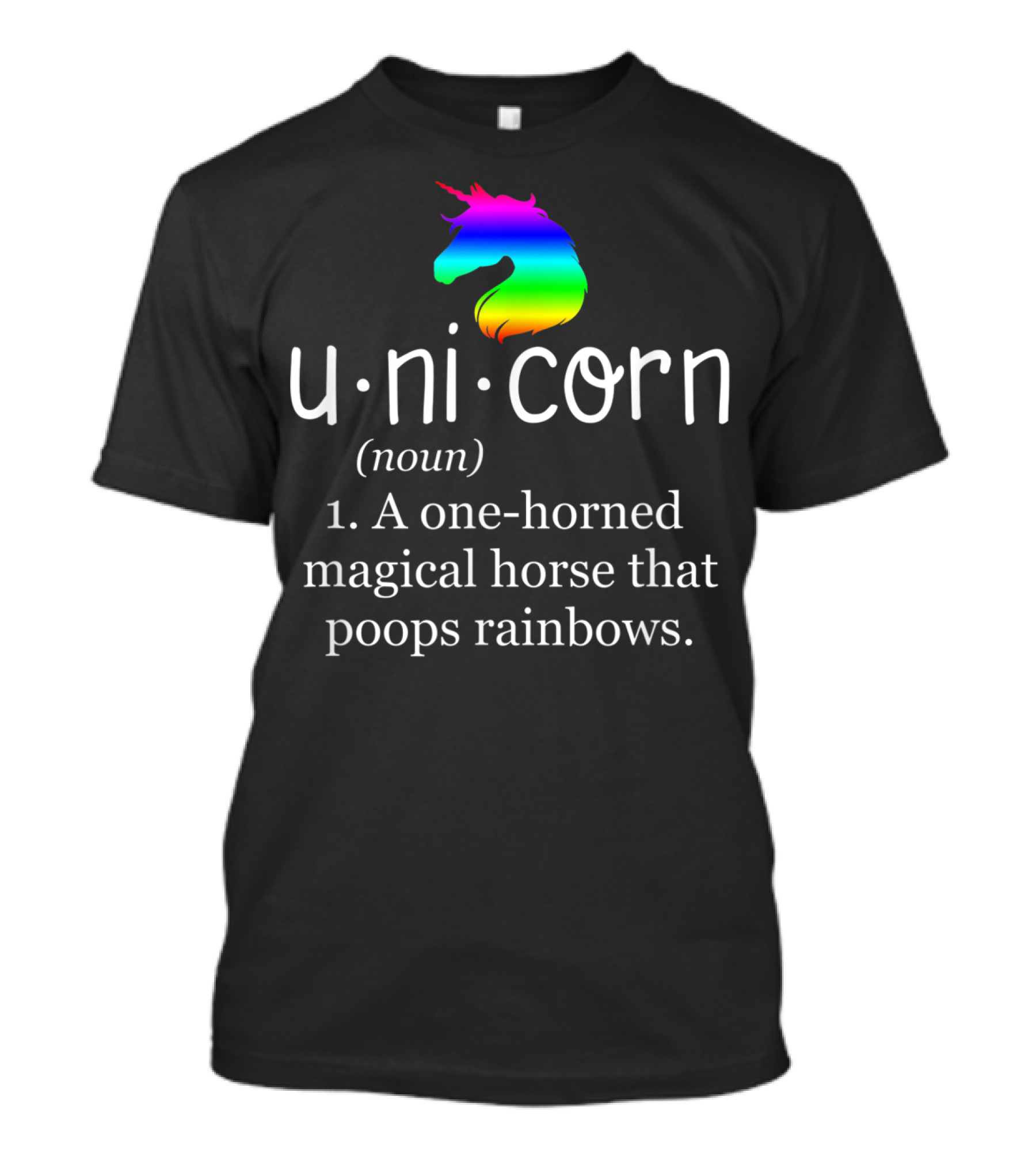The Unicorn Definition One-Horned Magical Horse Poops Rainbows T-shirt is designed for everyday wear and a consistent fit. Fabric is pre-shrunk ring-spun cotton with durable stitching. See the size chart below for exact measurements.