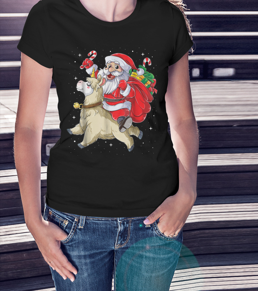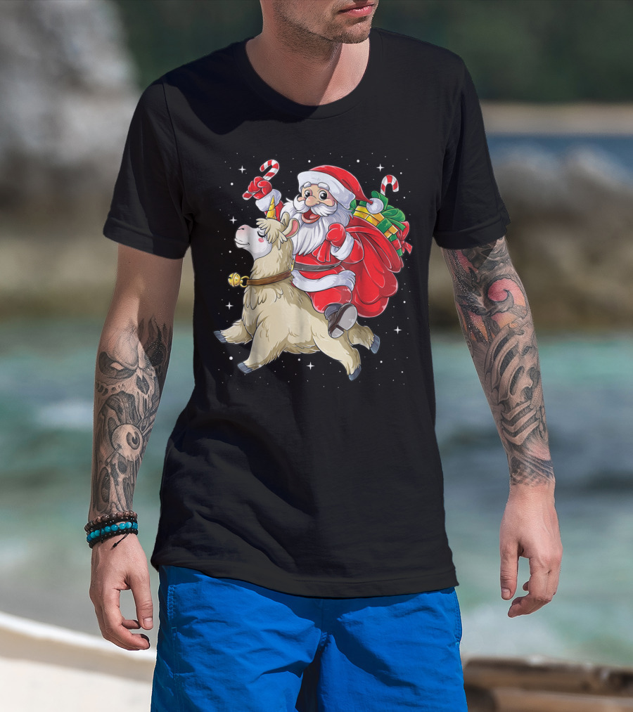 Santa Claus Riding Llamacorn Unicorn With Candy Canes And Gifts T-Shirt