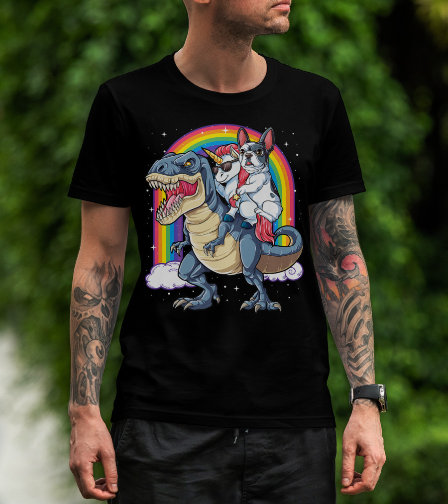 French Bulldog Unicorn Riding Dinosaur Rex With Rainbow Stars T-Shirt