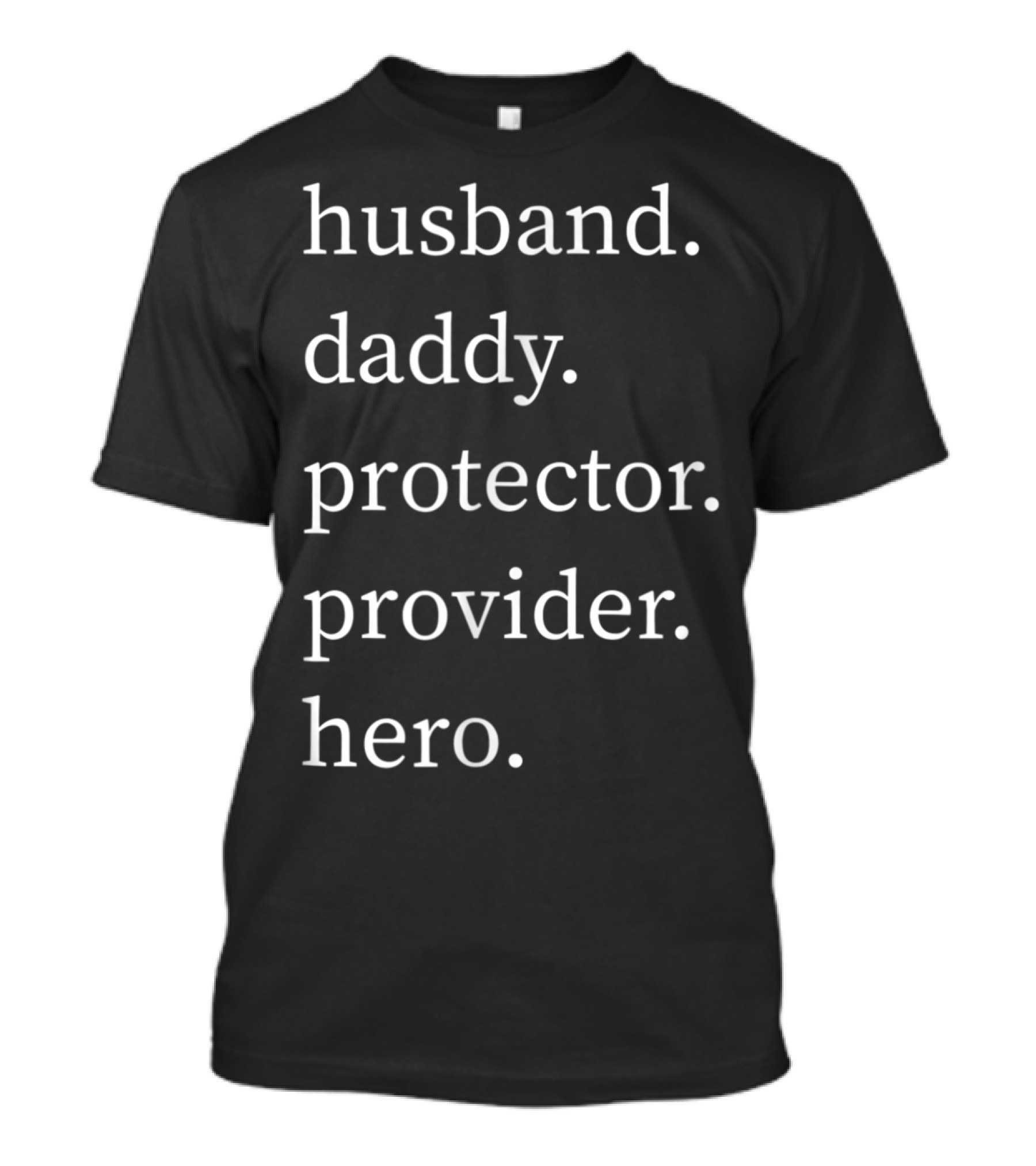 The Husband Daddy Protector Provider Hero T-shirt is designed for everyday wear and a consistent fit. Fabric is pre-shrunk ring-spun cotton with durable stitching. See the size chart below for exact measurements.