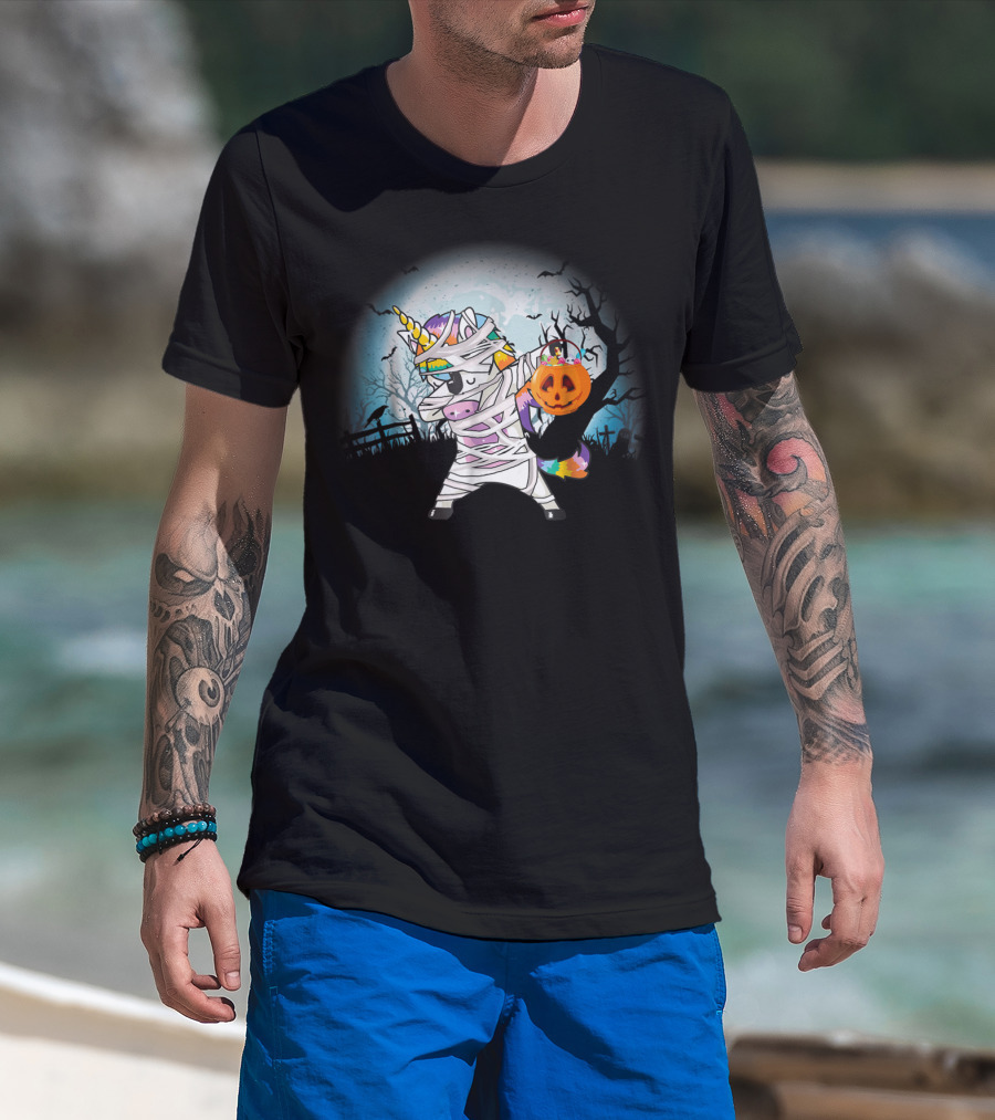 Halloween Mummy Unicorn Dabbing With Pumpkin Basket T-Shirt