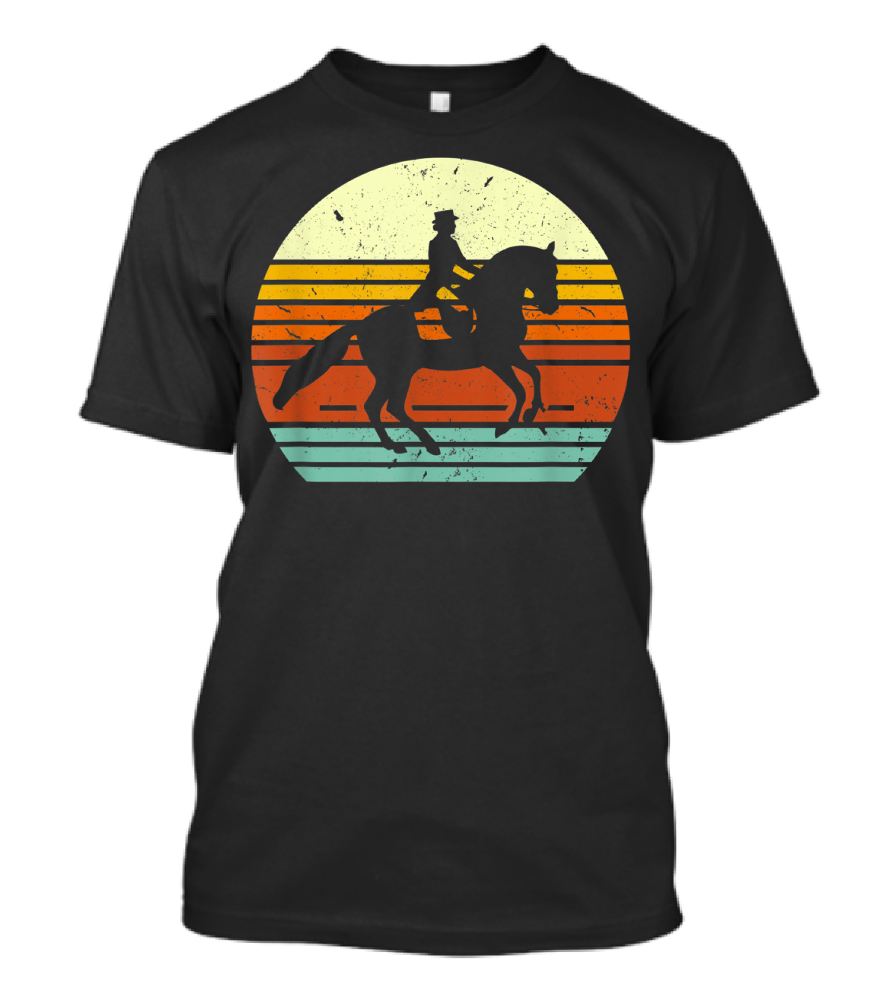 The Dressage Horse and English Rider Vintage Sunset T-shirt is designed for everyday wear and a consistent fit. Fabric is pre-shrunk ring-spun cotton with durable stitching. See the size chart below for exact measurements.